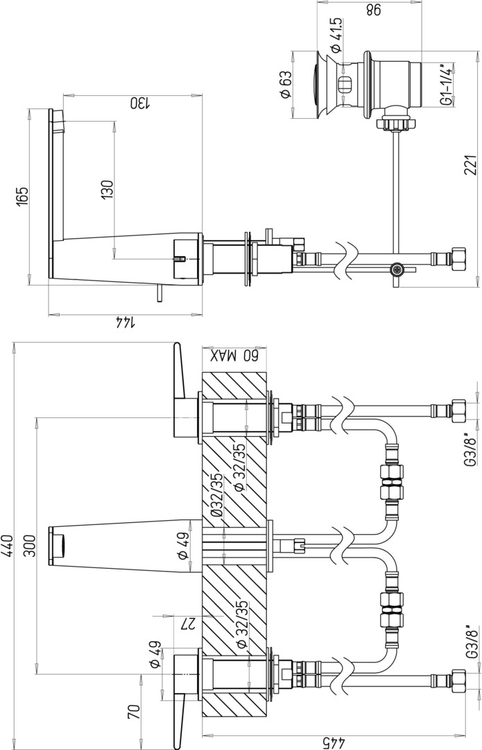440 x 144 x 165 mm, Rund, Drehen, Material aus Messing, Keramikkartusche, Standmontage, Anschlusstyp 3/8'', maximale Durchflussmenge bei 3 bar 4,3 l/min, Auslauflänge 130 mm, Auslaufhöhe 130 mm
