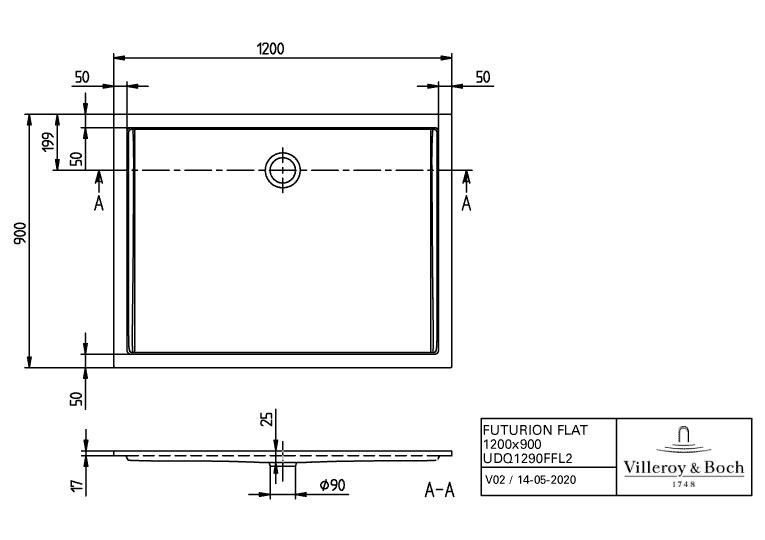 V&B Duschwanne Futurion Flat Quaryl, 120 x 90 x 1,7 cm, weiß UDQ1290FFL2V01
