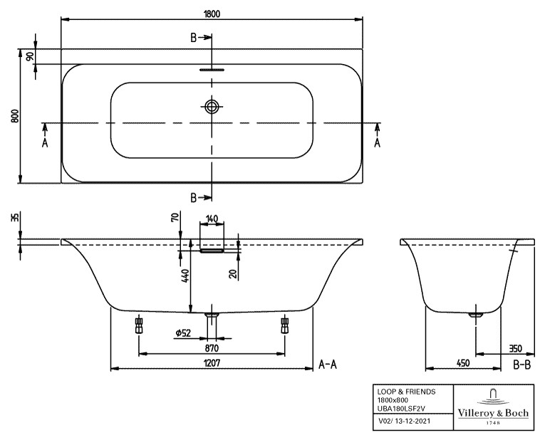 V&B Eck-Badewanne Duo Loop & Friends 180x80cm, eckige Innenform, Acryl, weiß VBUBA180LSF2V01