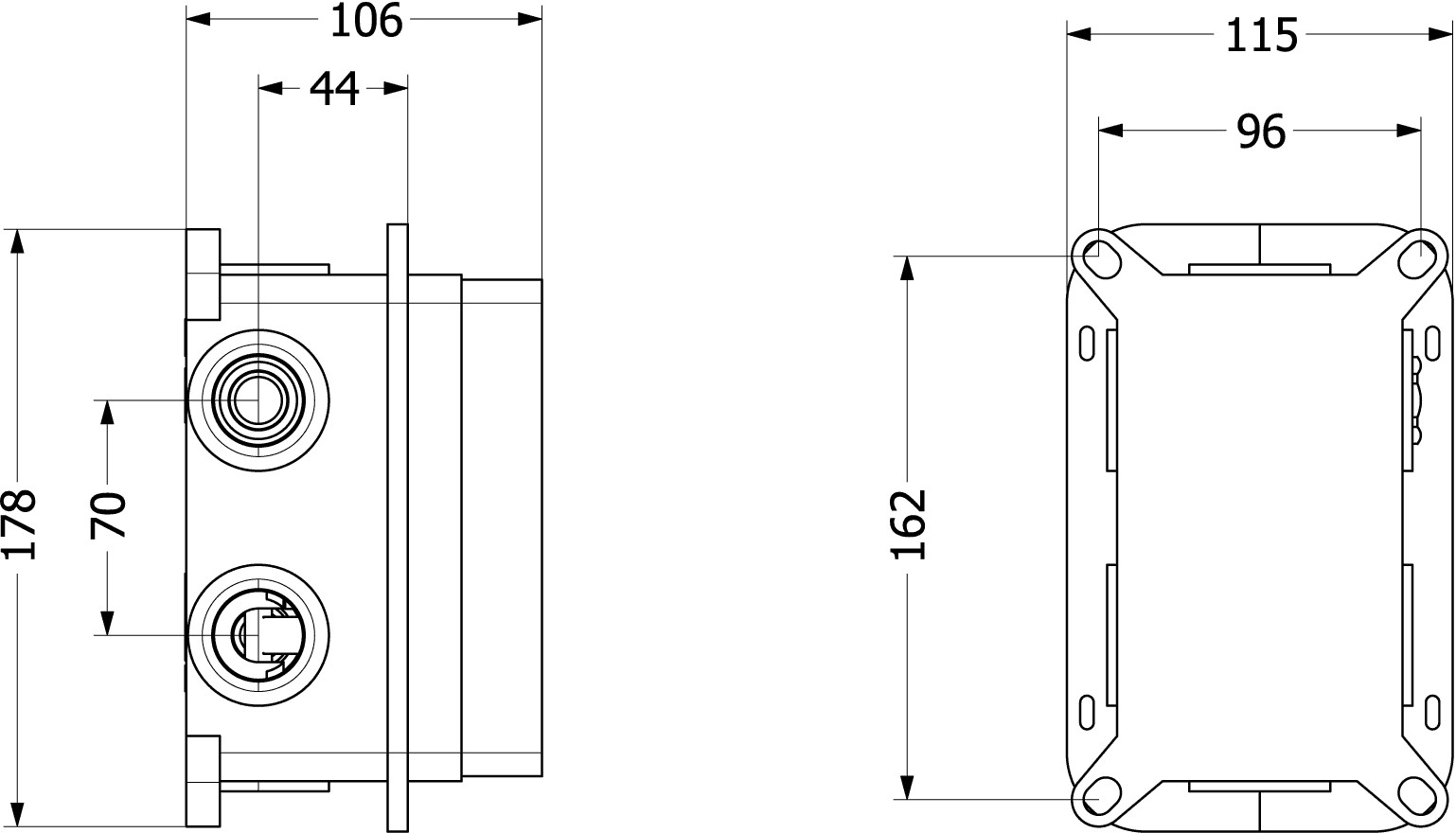 115 x 178 x 106 mm, Wandmontage, mit Rückflussschutz, Material aus Kunststoff, Min/Max Einbautiefe 84/106 mm, Durchflussrate bei 3 bar im Abgang Nr. 1 13,3 l/min, im Abgang Nr.2 13,7 l/min, im Abgang Nr.3 13,5 l/min