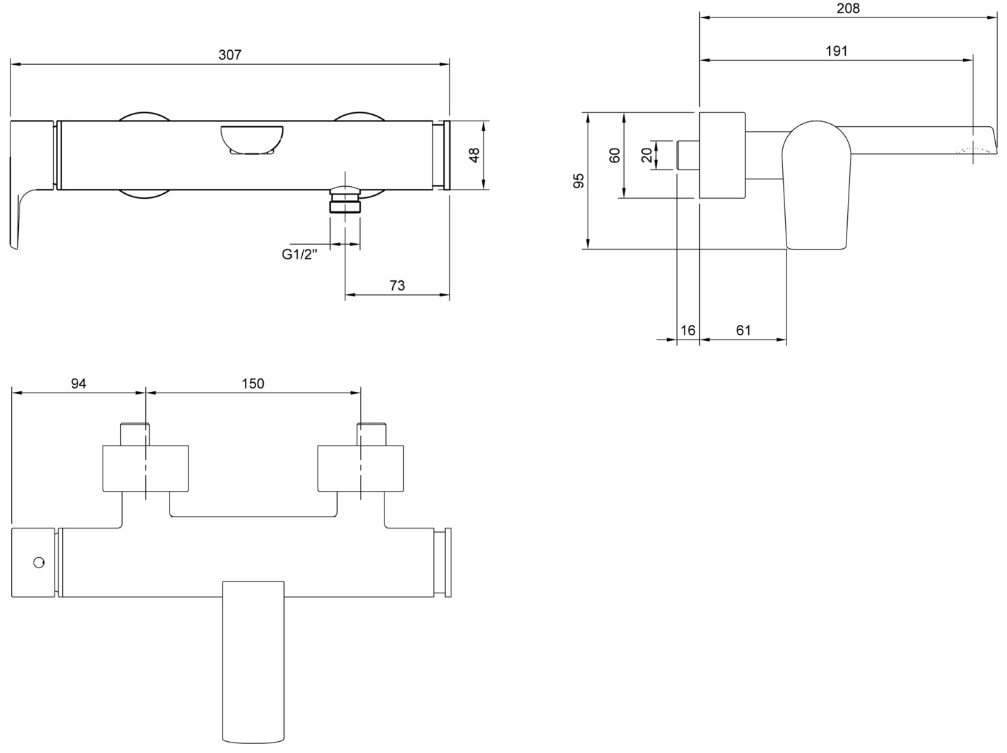 307 x 95 x 208 mm, Rund, Wandmontage, Kippen, S-Anschluss, Material aus Messing, Keramikkartusche, Anschlusstyp 1/2'', Handbrauseschlauch-Anschluss 1/2'', mit verstellbarem Strahlregler, maximale Durchflussmenge bei 3 bar 21,9 l/min, Auslauflänge 191 mm