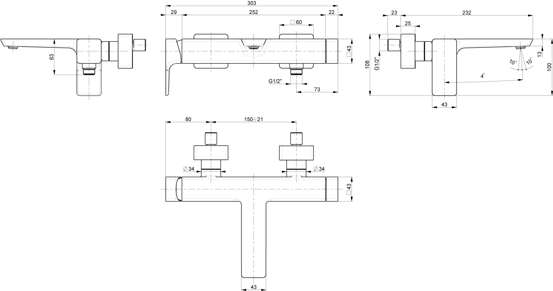 303 x 108 x 232 mm, Eckig, Kippen, Anschlusstyp 1/2'', Handbrauseschlauch-Anschluss 1/2'', mit verstellbarem Strahlregler, maximale Durchflussmenge bei 3 bar 17,6 l/min, Auslauflänge 209 mm