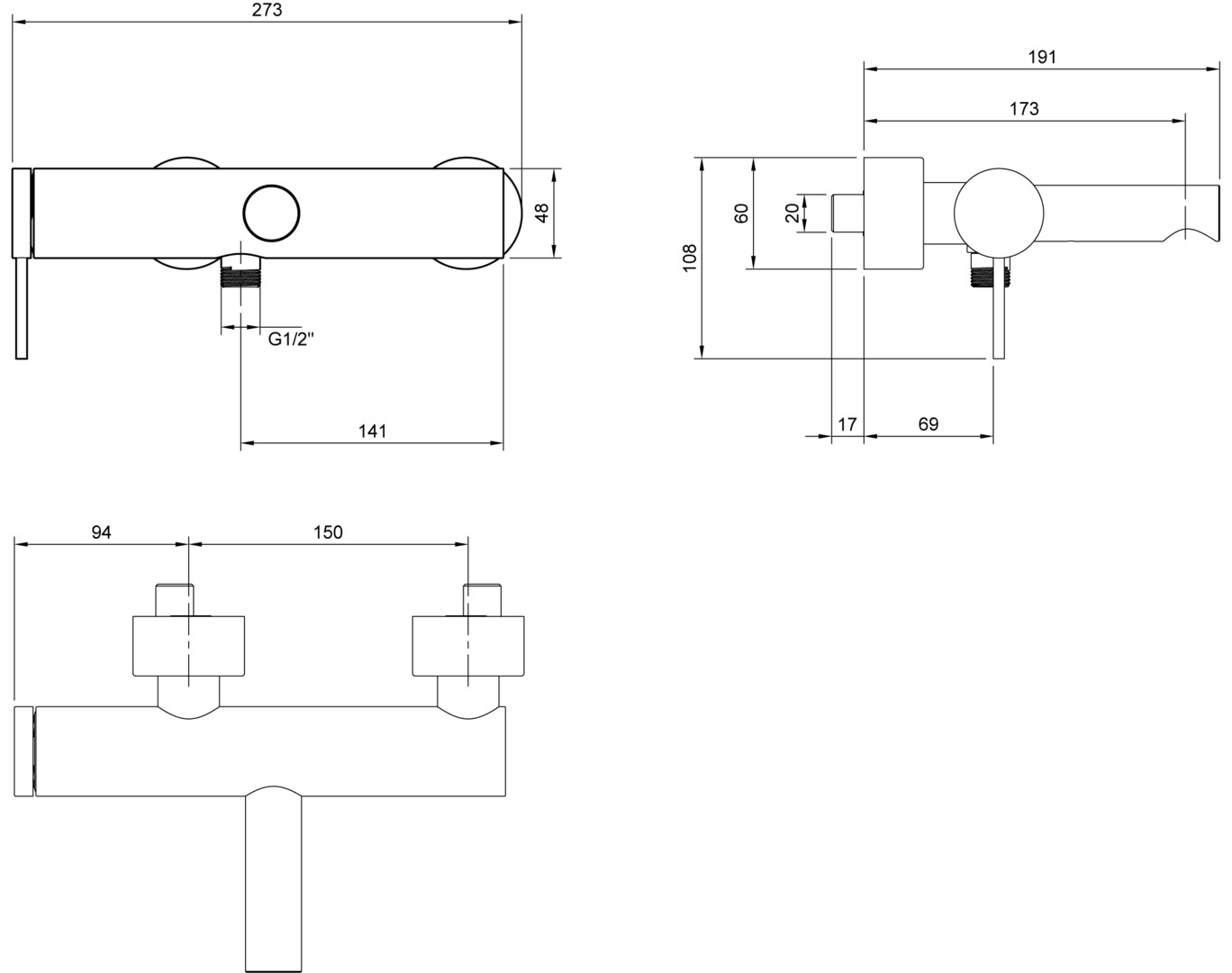 273 x 108 x 191 mm, Rund, Wandmontage, Kippen, Material aus Messing, Keramikkartusche, Anschlusstyp 1/2'', Handbrauseschlauch-Anschluss 1/2'', maximale Durchflussmenge bei 3 bar 18,4 l/min, Auslauflänge 173 mm