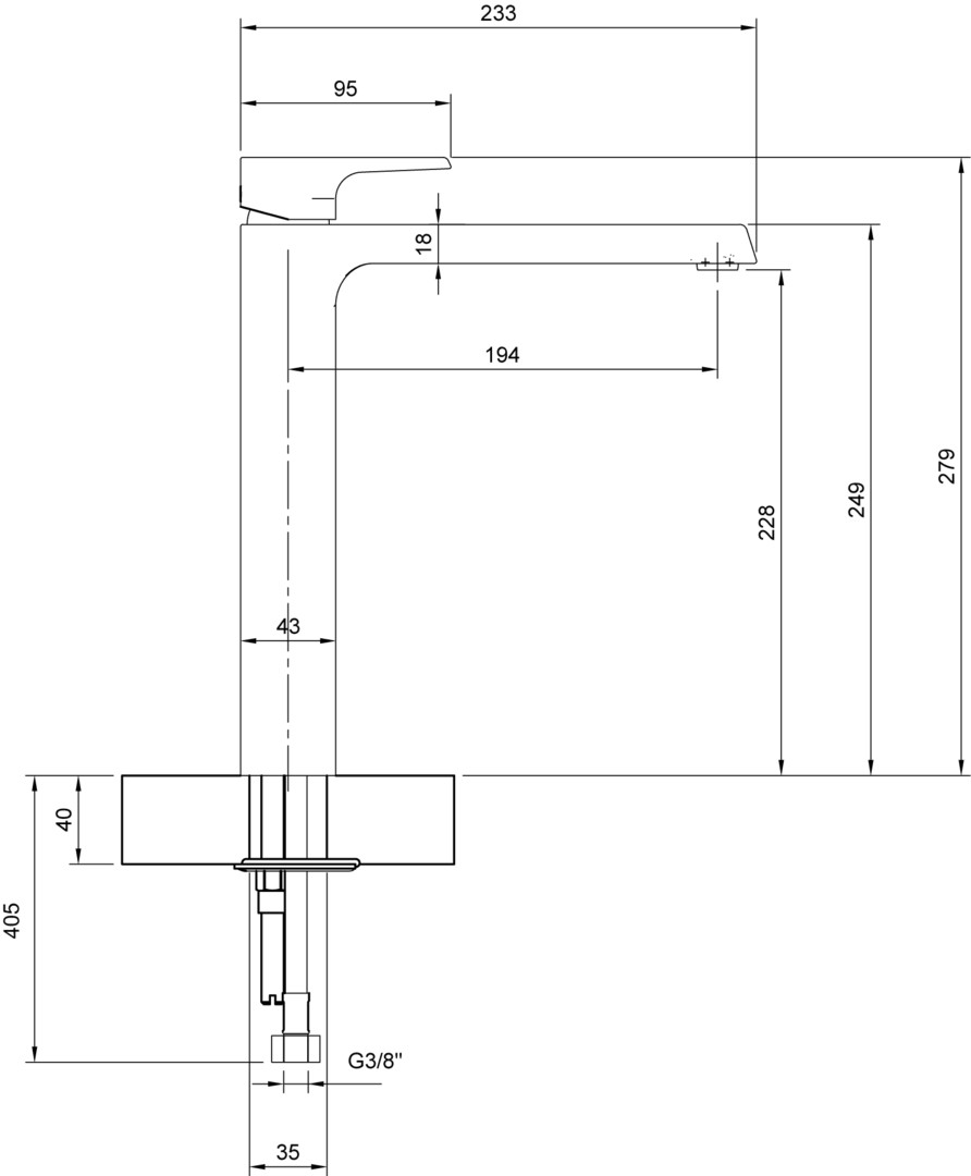 43 x 279 x 233 mm, Rund, Standmontage, Kippen, Material aus Messing, Keramikkartusche, Standmontage, Anschlusstyp 3/8'', maximale Durchflussmenge bei 3 bar 4,7 l/min, Auslauflänge 194 mm, Auslaufhöhe 228 mm