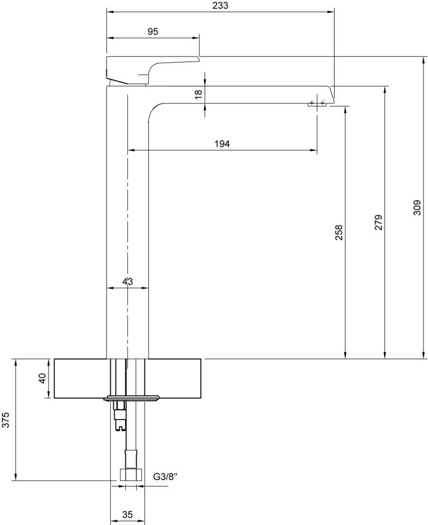 43 x 309 x 233 mm, Rund, Standmontage, Kippen, Material aus Messing, Keramikkartusche, Anschlusstyp 3/8'', maximale Durchflussmenge bei 3 bar 4,7 l/min, Auslauflänge 194 mm, Auslaufhöhe 258 mm