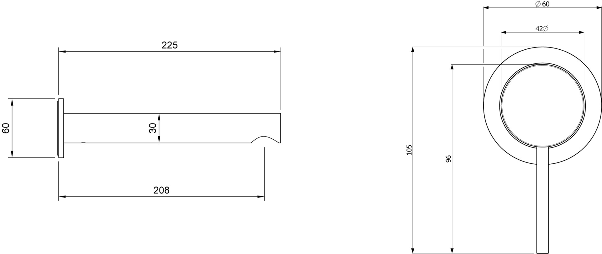 60 x 60 x 225 mm, Rund, Wandmontage, Kippen, Chrom, Material aus Messing, Keramikkartusche, Anschlusstyp 1/2'', maximale Durchflussmenge bei 3 bar 5,1 l/min, Auslauflänge 207 mm