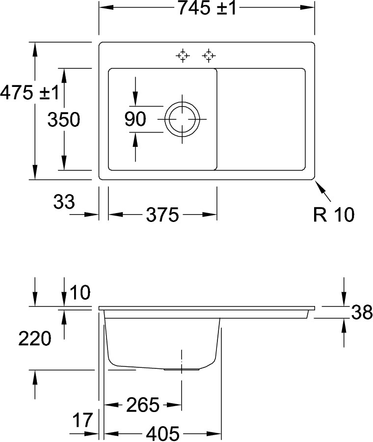 für flächenbündigen Einbau in Natur-/Keramik-/Glas- und Kunstplatten, minimale Unterschrankbreite 45 cm, Minimalstärke der Platte bei Platzierung mit Geschirrspüler mind. 4 cm