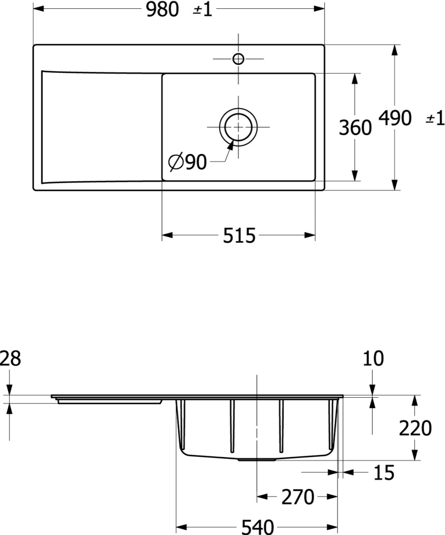 V&B Flächenbündige Spüle Subway Style 60 Flat rechts, mit Ablaufgarnitur, Handbetätigung, chromite CeramicPlus VB33611FJ0