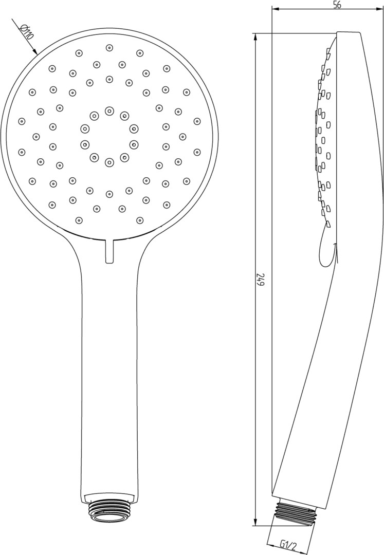 110 x 250 x 56 mm, Rund, Drücken, Antikalk-System, Material aus ABS, Handbrause mit Relax-, Massage- und Intensivstrahl, maximale Durchflussmenge bei 3 bar 8,7 l/min, Brause Ø 110 mm
