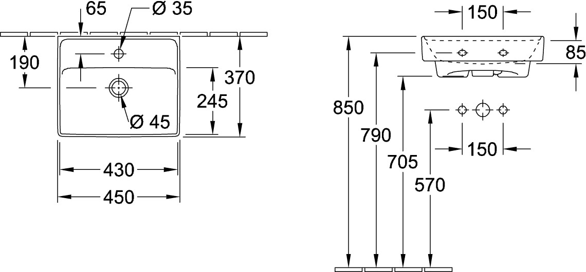 V&B Handwaschbecken Collaro 45x37cm, ohne Überlauf, weiß C-plus