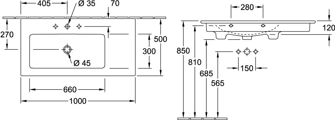 V&B Möbel-Waschtisch VENTICELLO 100 x 50 cm, mit Hahnloch, mit Überlauf, links, weiß