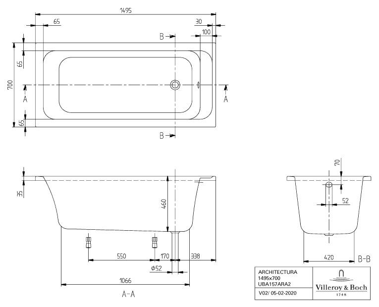 V&B Rechteck-Badewanne Architectura Solo Acryl, 150 x 70 cm, weiß VBUBA157ARA2V01
