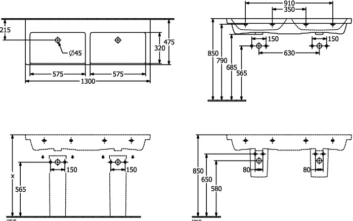 V&B Schrank-Doppelwaschtisch Subway 3.0 130x47cm, eckig, mit je 1 Hahnloch/ohne Überlauf, weiß C-plus VB4A71D1R1