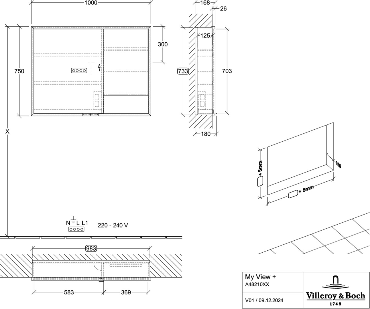 V&B Spiegelschrank My View + 100 x 75 x 16,8 cm, Pure White, LED-Beleuchtung, Aluminium silber matt eloxiert VBA48210VF