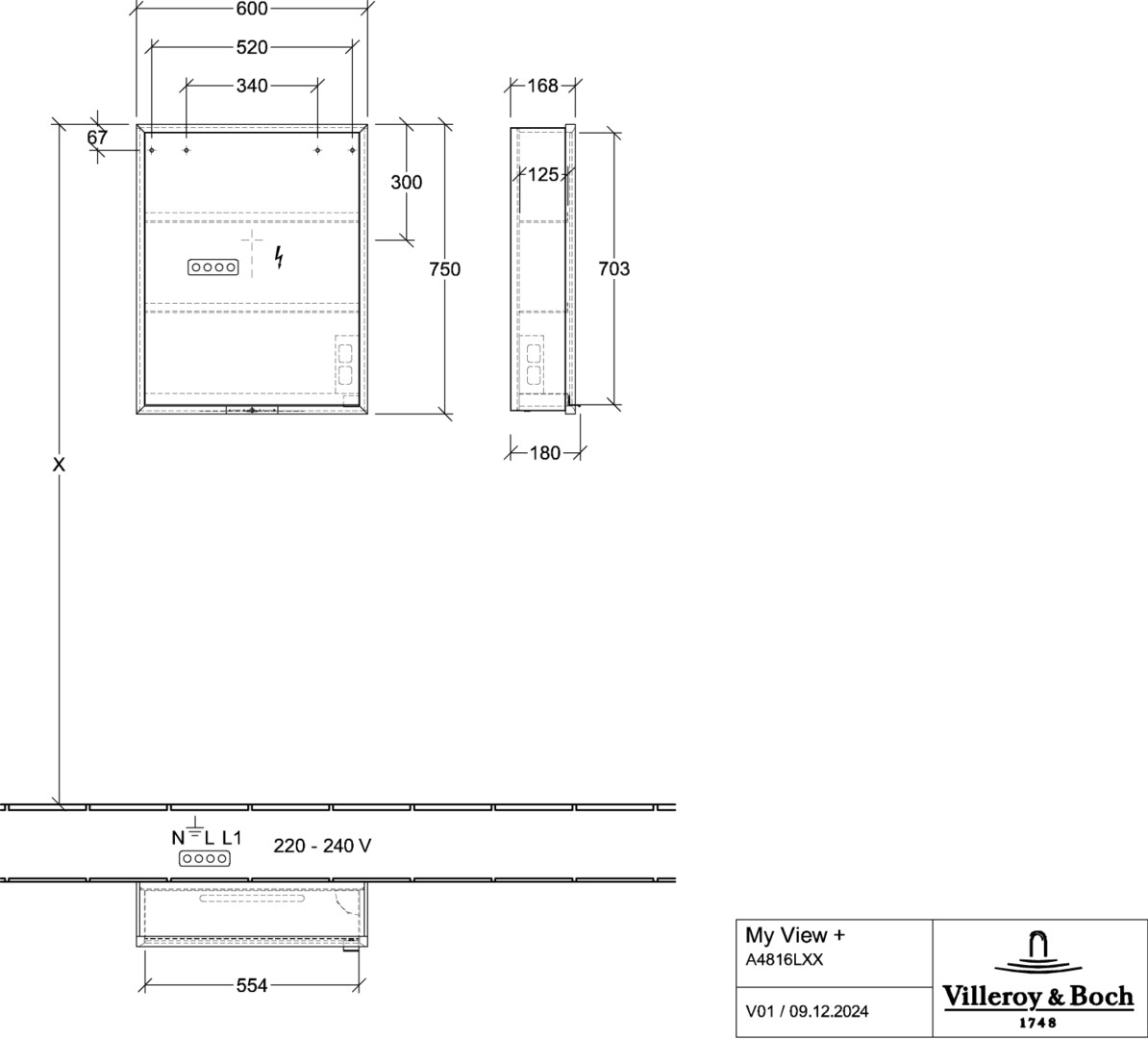 1 x Tür, 1 x Sensorschalter außen, 2 x Steckdose innen, 2 x Ablageboden aus Aluminium, 1 x Ablageschale, 1 x Vergrößerungsspiegel, 1 x Magnetleiste, IP 44, Montage vor der Wand, Aufputz, mit Befestigungsset