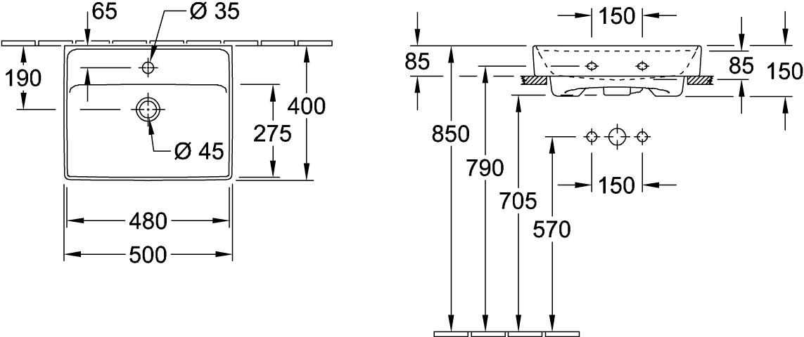 V&B Waschtisch Collaro 50 x 40 cm, mit Überlauf, Unterseite geschliffen, weiß VB43345G01