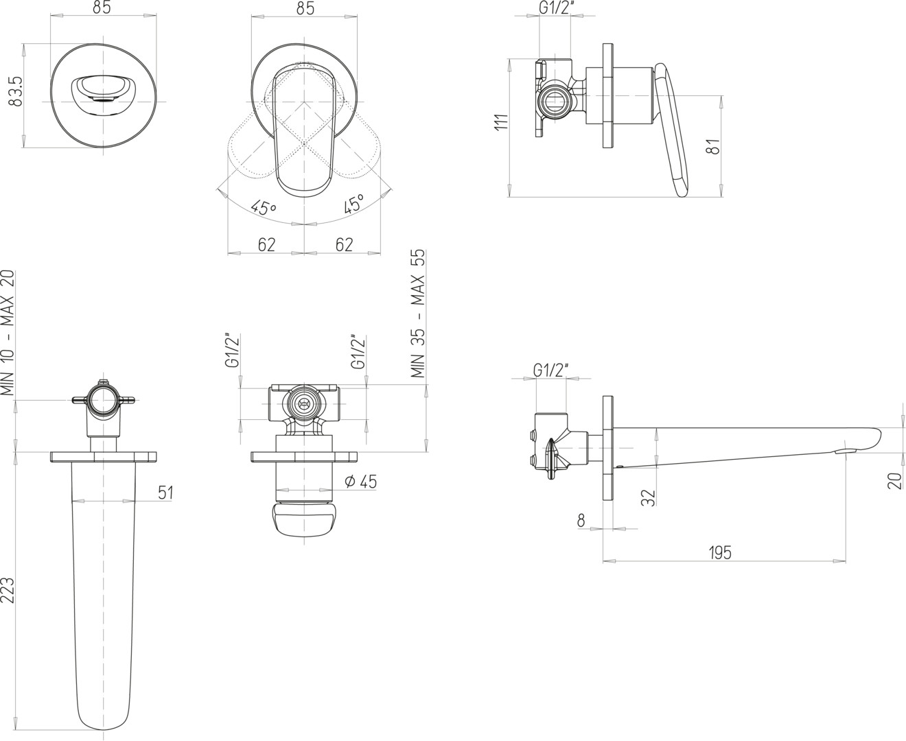 185 x 115 x 223 mm, Rund, Kippen, Messing, Anschlusstyp 1/2'', mit verstellbarem Strahlregler, mit Einbaukörper, Auslauflänge 195 mm
