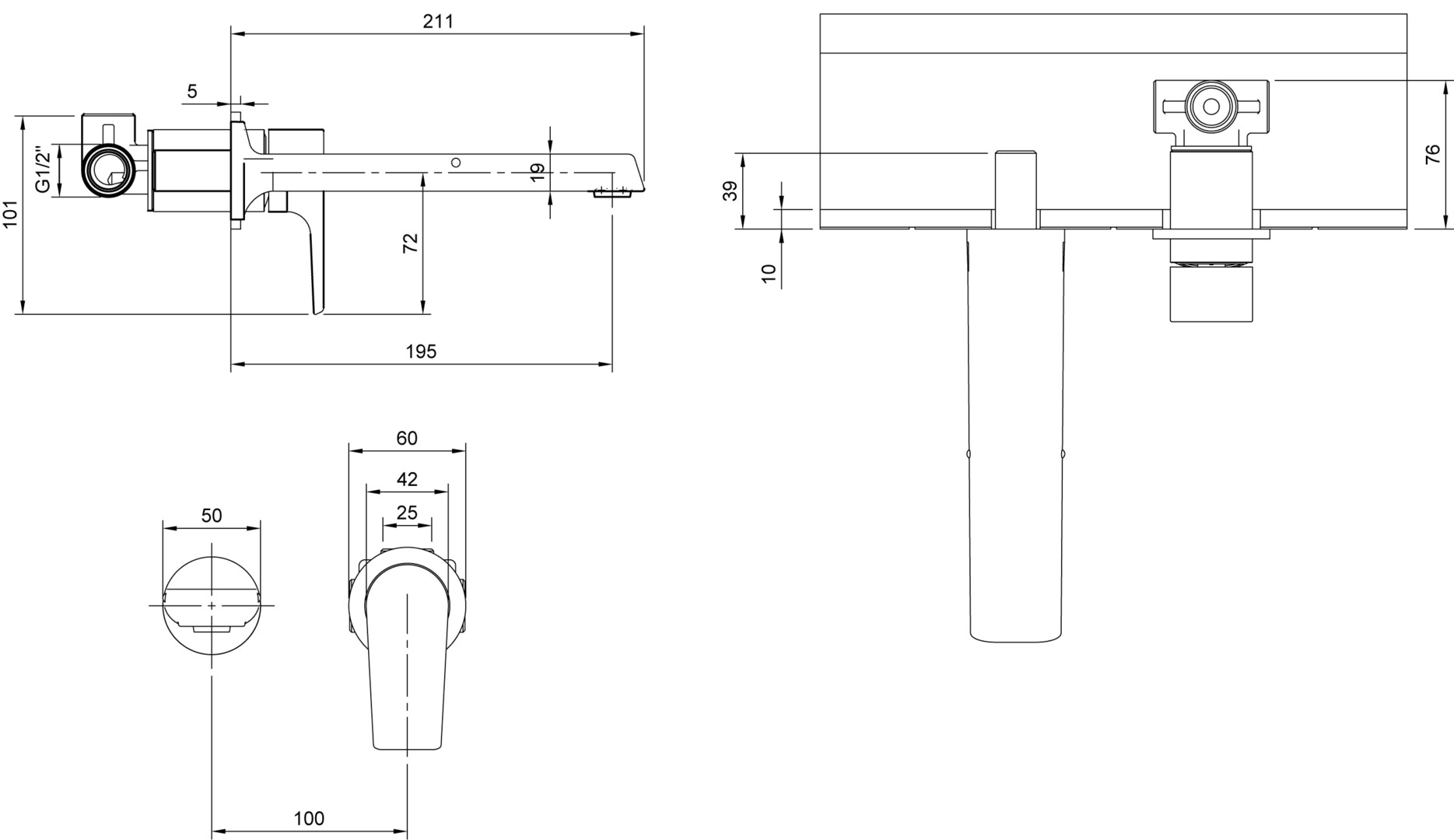 155 x 103 x 211 mm, Rund, Wandmontage, Kippen, Material aus Messing, Keramikkartusche, mit verstellbarem Strahlregler, mit Einbaukörper, Anschlusstyp 1/2', maximale Durchflussmenge bei 3 bar 4,9 l/min, Auslauflänge 195 mm