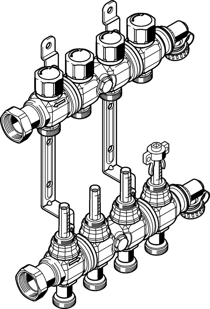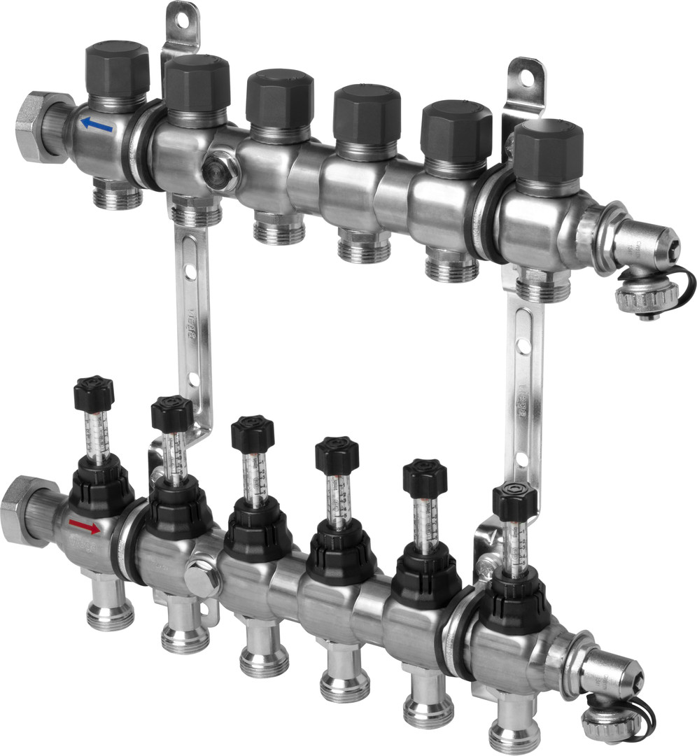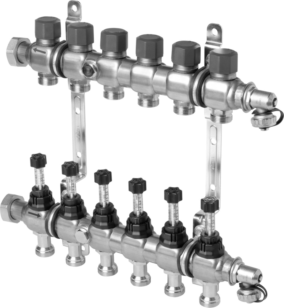 Anschluss links- und rechtsseitig, Durchflussmengenmesser 0-5 l/min, 1 KFE-Hahn je Heizkreisverteilerbalken, Schutzkappe, Wandhalterungen verzinkt/schallgedämmt, für Fonterra-Flächentemperierung, geeignet für Stellantrieb Modell1249, 1249.1, Fonterra Smart Control-Stellantrieb Modell1250.15, Eurokonus mit Überwurfmutter G1