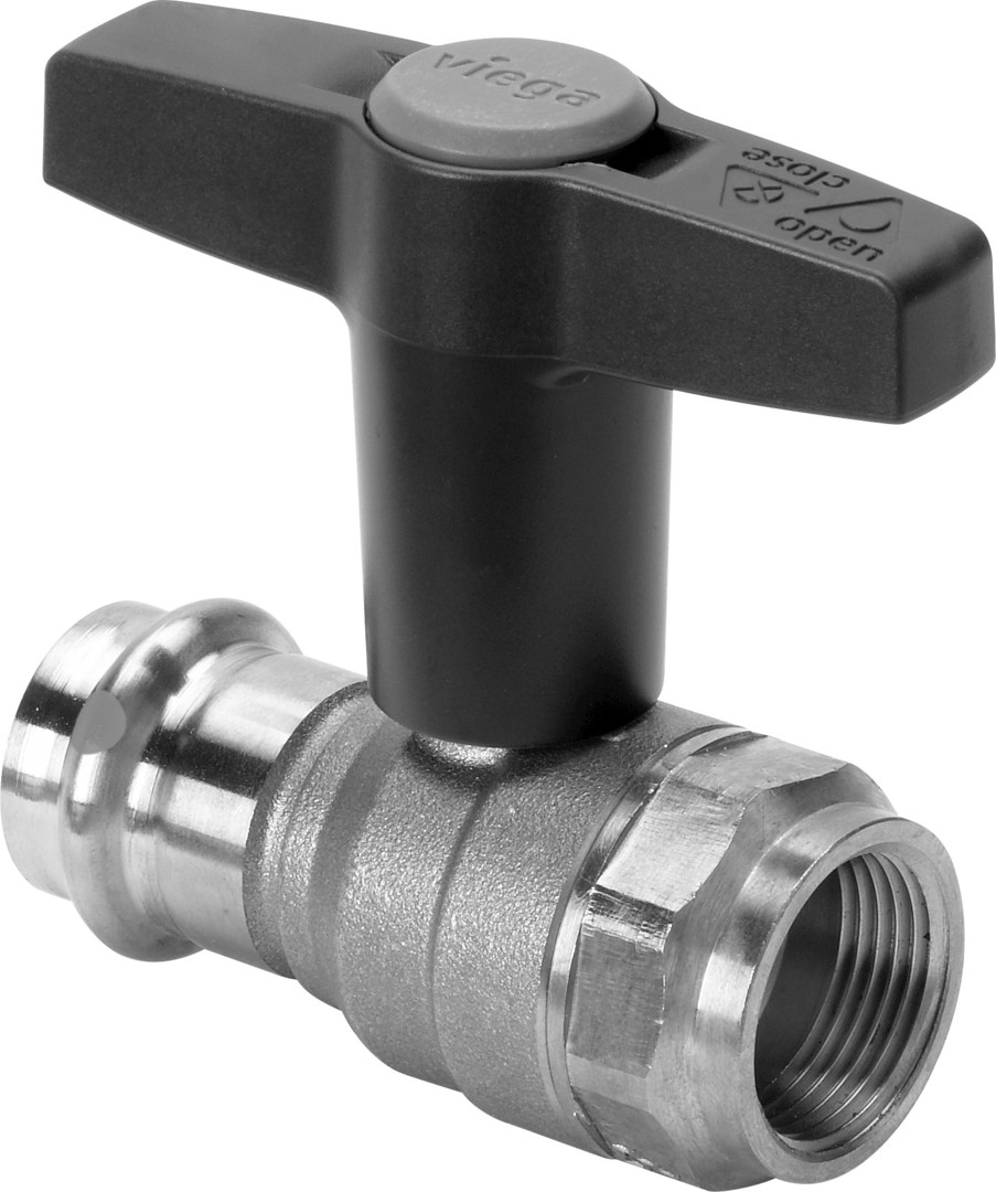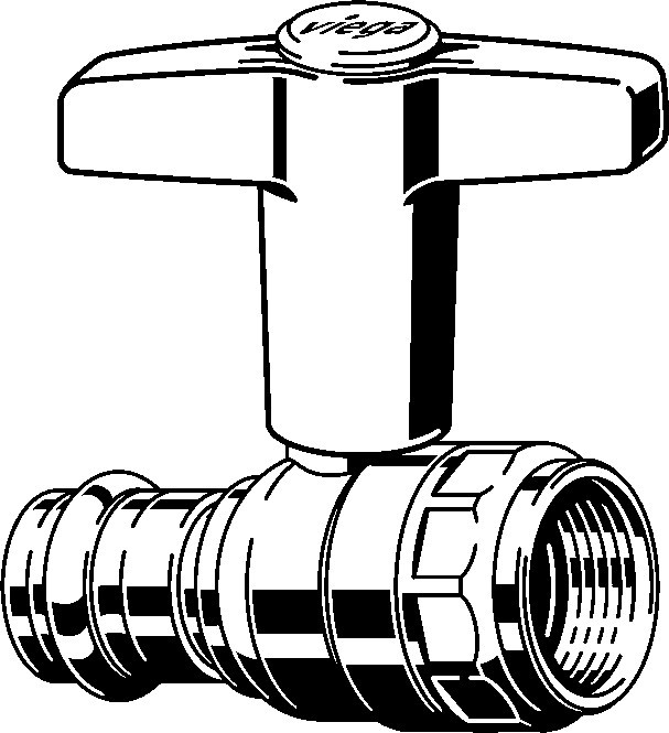 Pressanschluss, Ventilgehäuse Siliziumbronze nach DIN 50930-6/DIN EN 1982, mit wartungsfreier Schaltwelle, Betätigungshebel T-Form mit Medienkennzeichnung grün/rot auswechselbar, Dichtelement EPDM, Betriebsdruck 1,6 MPa (PN 16), Betriebstemperatur max. 110 °C, mit DVGW-Prüfzeichen