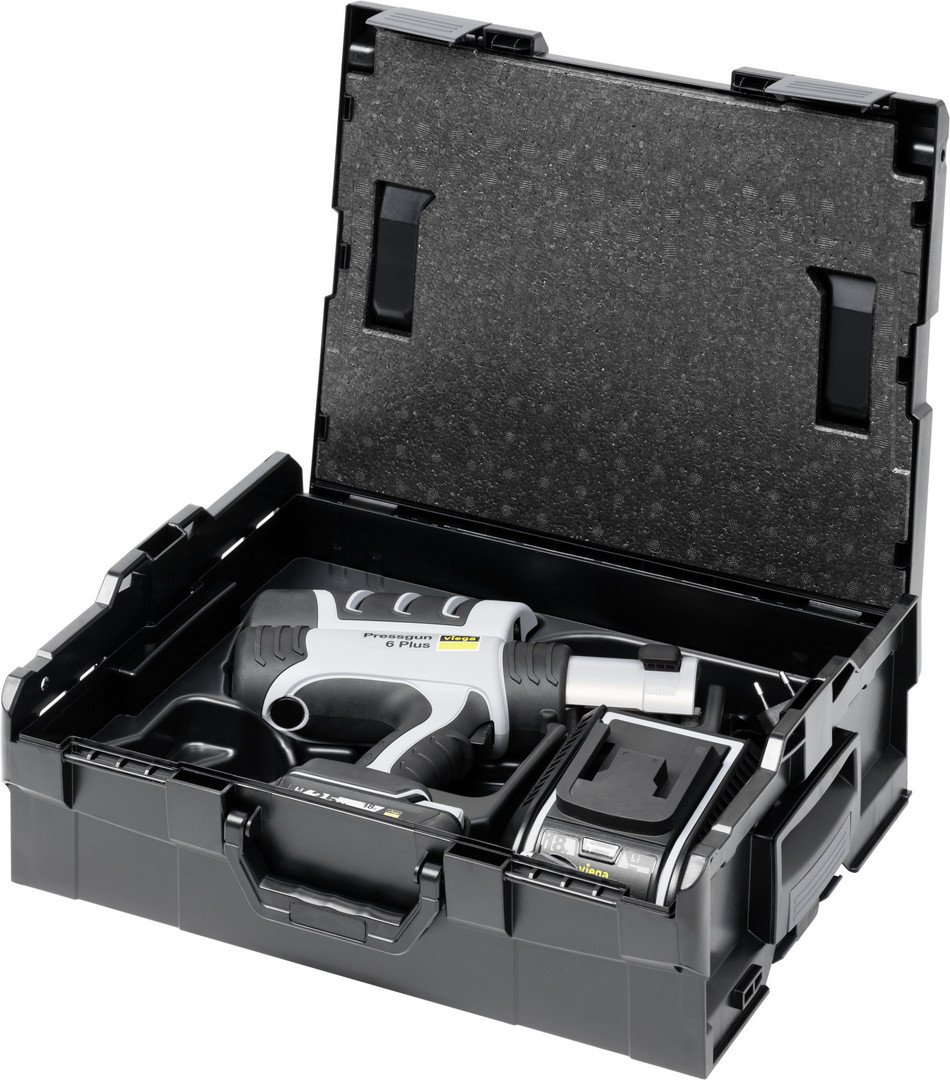 für Systempressbacken/-ringe/-ketten und (Gelenk-) Zugbacken mit PT2-Schnittstelle, mit Pressgun-Press Booster, Anbindung an Viega Tool Service, ausgestattet mit Systemkoffer, Koffereinsatz Pressgun 6 Plus, Deckeleinlage, Akku-Ladegerät für Viega 18 V-Lithium-Ionen-Akkus, Anschlusskabel Typ C (CEE7/16)/C7, Anschlusskabel 12 V-Bordspannungsstecker SAE J563, Akku, Pressbackenaufnahme um 360° drehbar, Ausstattung mit Akku 18 V/2,5 Ah, Akku-Ladegerät 110–250 V/50–60 Hz/12 V, Presskraft 32 kN, über APP steuerbar (z.B. Informationen aufgerufen, der Fahrmodus könnte geändert werden oder die Nutzungssperre konfiguriert werden)