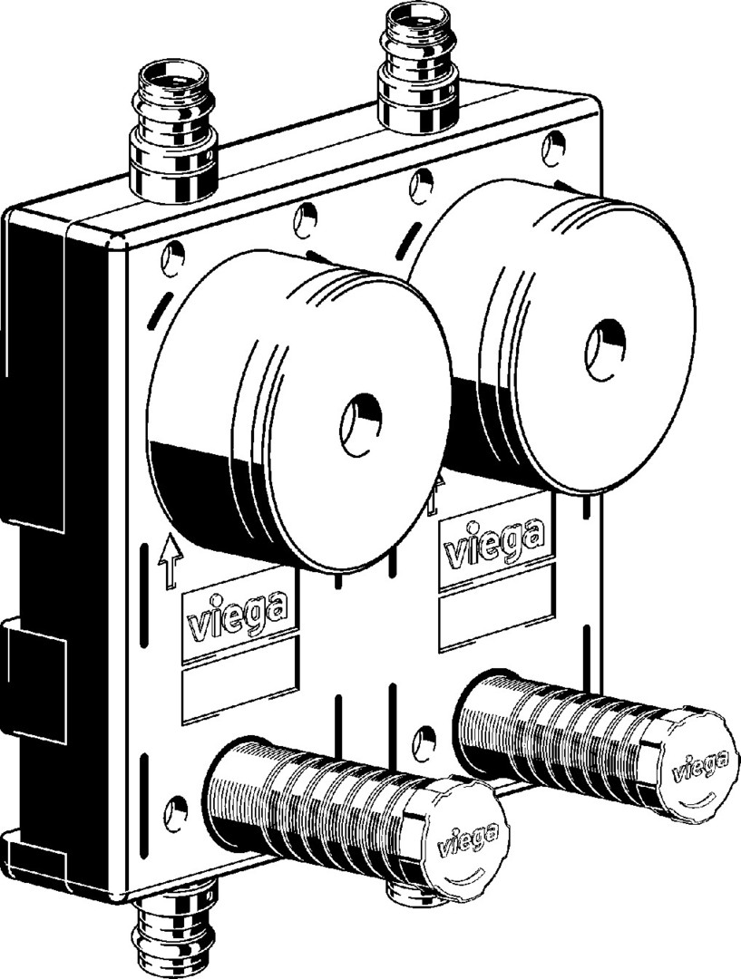 ohne Messkapseln, mit 2 UP-Geradsitzventil, Ventilgehäuse Rotguss oder Siliziumbronze nach DIN 50930-6/DIN EN 1982, Oberteil, Ventilsitz und Ventiltellereinheit Edelstahl, Bauschutz, Aufnahme für 2 Koax G2-Messkapsel, Blindflansch, Dämmbox, Dichtelemente EPDM, Betriebstemperatur max. 90 °C, mit DVGW-Prüfzeichen