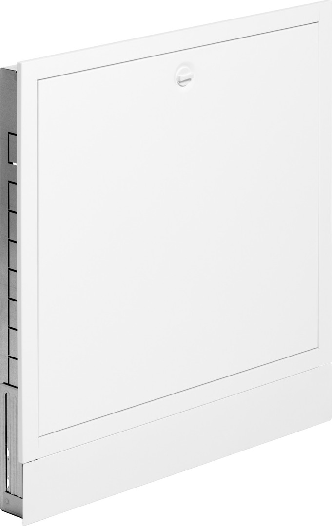 für Flächentemperierung, geeignet für Fonterra-Heizkreisverteiler DN 25 Modell und 1010, Stahlblech feuerverzinkt/weiß=RA L 9016, höhenverstellbar von 762-942 mm, Abschlussblende 107 mm, Rahmen und Tür, Abschlussblende abnehmbar für sichere Rohrführung im Anschlussbereich, Universalhalterung für Heizkreisverteiler, Hutschiene zur Aufnahme von Regelungskomponenten