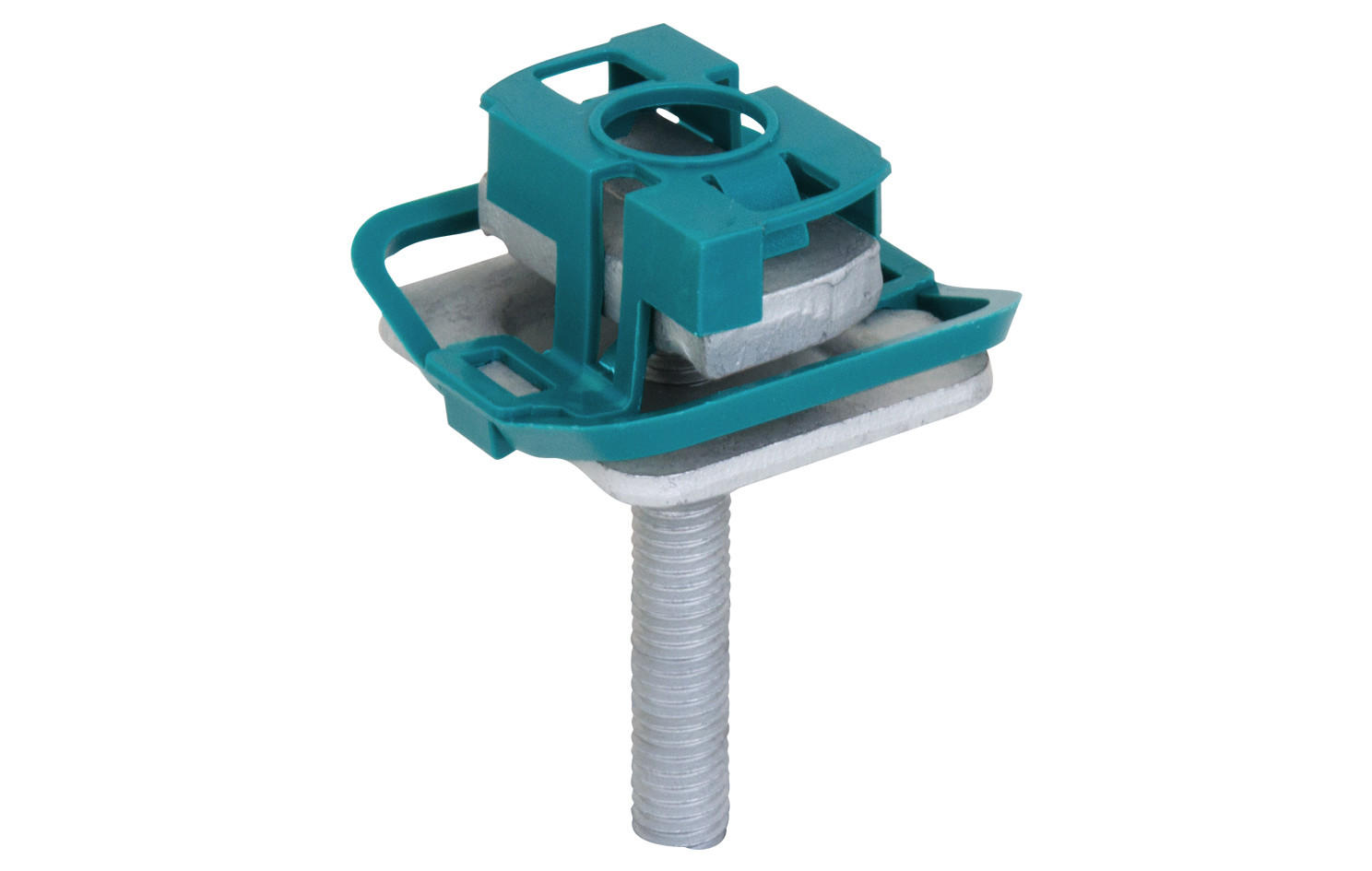 komplett vormontierte Schiebemutter mit Gewindestift, Unterlegscheibe und Federring, durch vormontierte Klemmfeder leicht einsetzbar und bis zur Endfixierung flexibel umpositionierbar, Klemmfeder aus Polyoxymethylen, grün, Oberflächenbeschichtung Ultra Protect Systemtechnologie, ein System für Installationen im Innen- und Außenbereich, besteht min. 1000 Std. Salzsprühtest nach DIN ISO 9227