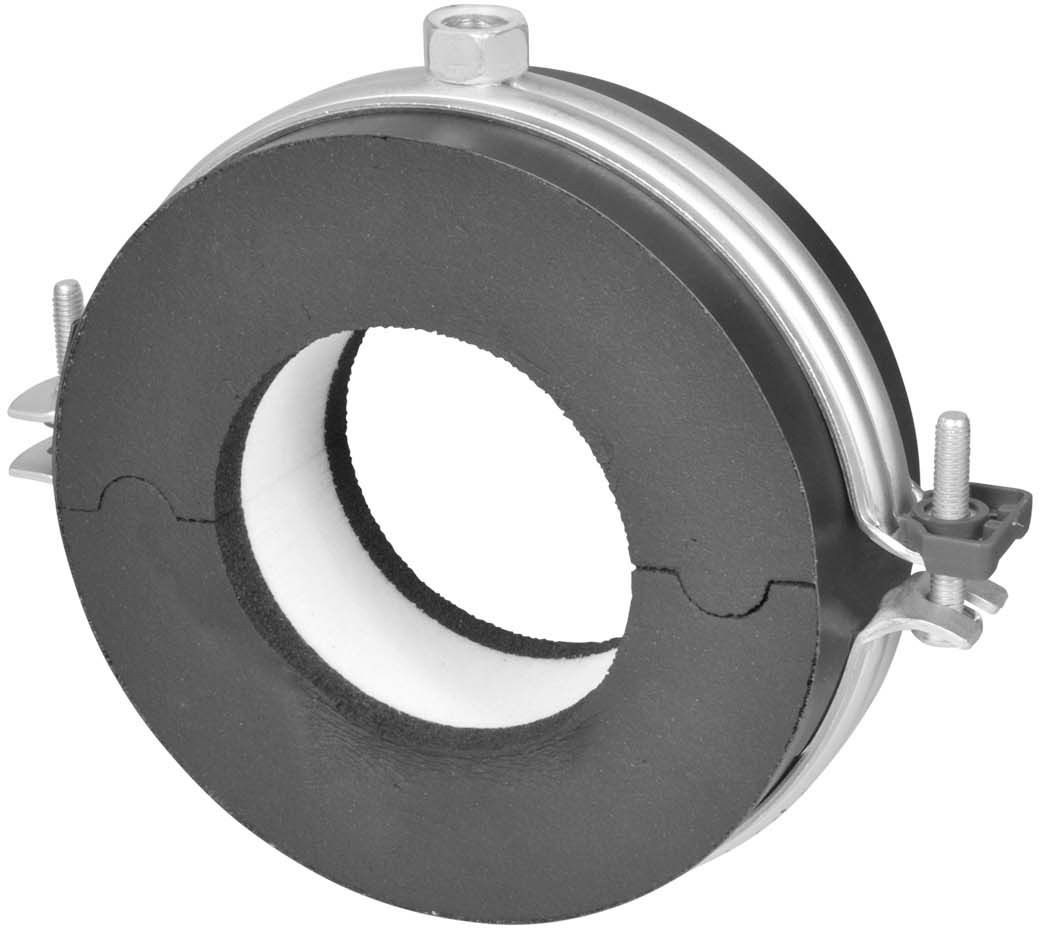 isolierte Rohrbefestigung mit Schelle BIS Bifix G2, Schelle mit Sicherheitsschnellverschluss, zur Befestigung von thermisch isolierten Rohren aus Stahl, Kupfer oder Edelstahl, dampfdicht verklebbar mit Rohrisolierung, Stoßflächen der Isolierschale bei Montage waagrecht ausrichten und verkleben (um Zug- und Druckkräfte zu verhindern), mit selbstklebender PVC-Überlappung zum leichten Verschluss des Rohrträgers, Material Schelle aus Stahl, Isolierschale aus Elastomerkautschuk, mit PIR-Kern und Dampfsperre ummantelt, enthält kein FCKW, HFCKW, Formaldehyd oder Cadmium, ausgezeichnete isolierende und mechanische Eigenschaften, BIS Bifix G2 Oberflächenbeschichtung Systemtechnologie, ein System für Installationen im Innen- und Außenbereich, besteht min. 1.000 Std. Salzsprühtest nach DIN ISO 9227, Gebrauchstemperatur -45°C bis +105°C