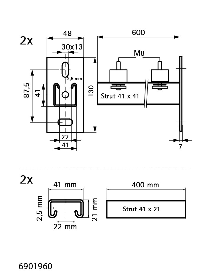 universeller Befestigungssatz zur Wandbefestigung von Klimaanlagen, Heizapparaten, Kompressoren und anderen schweren Geräten, Schallschutz mittels Schwingungsdämpfer (Stützen aus vulkanisiertem Gummi), bestehend aus 2x Wandkonsolen aus Strut 41 x 41 mm, 2x Wandschienen aus Strut 41 x 21 mm, 4x Schwingungsdämpfer, 2x Schienenendstopfen