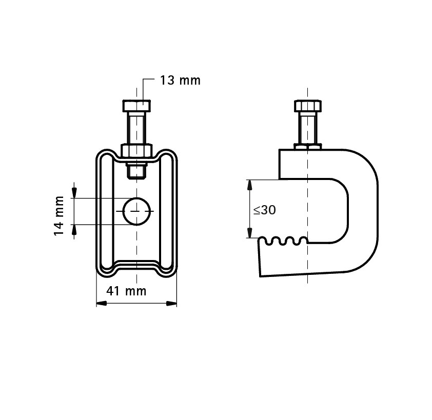 zur Befestigung an Stahlträgern ohne Schweißen oder Bohren, mit Loch 14 mm zur Befestigung von IC-Clip, Gewindestift oder S-Haken, mit Verzahnung für besseren Halt