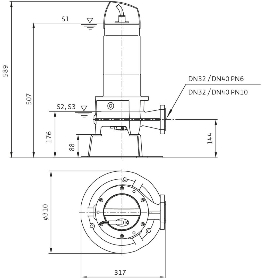vollüberflutbare Schneidwerkpumpe für die stationäre und transportable Nassaufstellung im intermittierenden Betrieb, radiales Schneidwerk mit Doppelschereffekt, DN 32/40, Motor mit zwei Gleitringdichtungen und optionaler Überwachung der Dichtungskammer, zur Förderung in gewerblichen Bereichen von Abwasser mit Fäkalien und Schmutzwasser (mit geringen Mengen Sand), erfüllt die Anforderungen nach EN 12050-1, Betriebsart (ausgetaucht) S2-15 Min. / S3-10%, Anschlusskabel 10 m