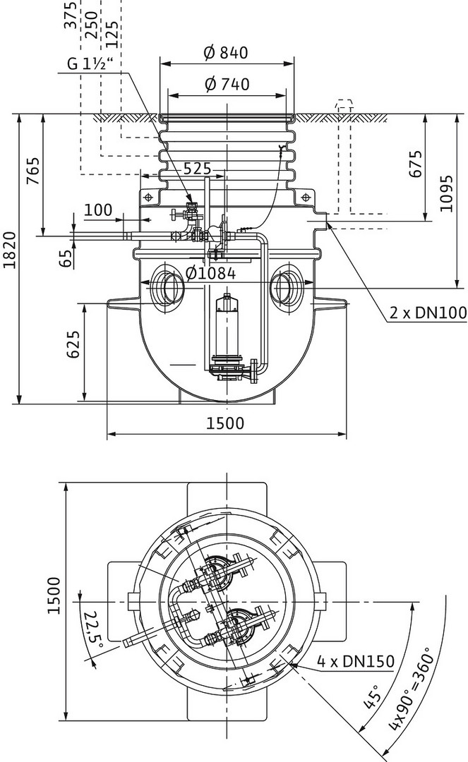 Pumpenschacht aus Kunststoff zum Einsetzen in das Erdreich, Förderung von fäkalienhaltigem oder vorgereinigtem Abwasser, das nicht über ein natürliches Gefälle dem Kanalsystem zugeführt werden kann, sowie zum Entwässern von Gegenständen, die unterhalb der Rückstauebene liegen, Pumpenschacht mit vormontierter Verrohrung, Überwasserkupplung, Rückflussverhinderer, Absperrschieber, Spülanschluss G 1 1/2, Edelstahlkette mit Befestigungshaken, Haltestab für Niveausensor oder Schwimmerschalter mit Montagezubehör, Anschlussmaterial für zwei DN 150 KG-Zulaufrohre, Kette, Einbau- und Betriebsanleitung, bei Doppelpumpenstationen wird jeweils die doppelte Anzahl an Armaturen (Überwasserkupplungen, Absperrschieber, …) geliefert, Ablagerungsfreier Sammelraum, hohe Festigkeit durch halbkugelförmigen Schachtboden, vier Zuläufe vor Ort auswählbar, Edelstahlverrohrung in V4A