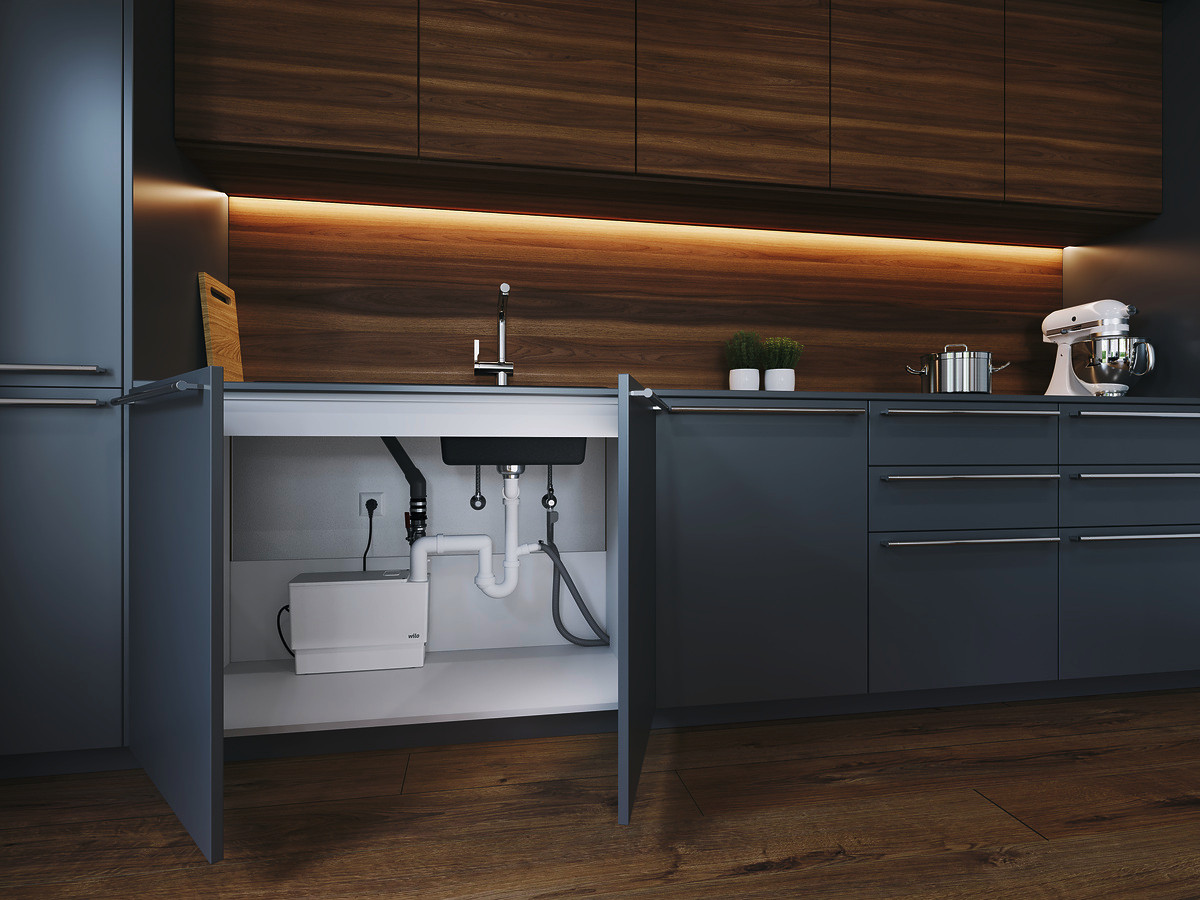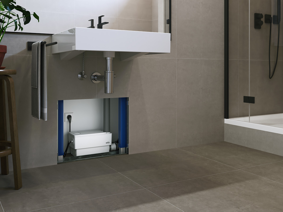 anschlussfertige Hebeanlage für die Entwässerung von Waschbecken, Dusche, Badewanne und WC, für die Installation innerhalb von Räumen oder als Vorwandinstallation, zum Anschluss der folgenden Entwässerungsgegenstände, MINI3-XXS für Waschbecken und Dusche, MINI3-XS für Waschbecken, Dusche, Badewanne, Geschirrspüler, Waschmaschine, MINI3-XS/WC für Toilette, Waschbecken, Dusche, MINI3-XXS und MINI3-XS zur Sammlung und Förderung in häuslichen Bereichen von Abwasser ohne Fäkalien, MINI3-XS/WC zur Sammlung und Förderung in häuslichen Bereichen von Abwasser mit Fäkalien