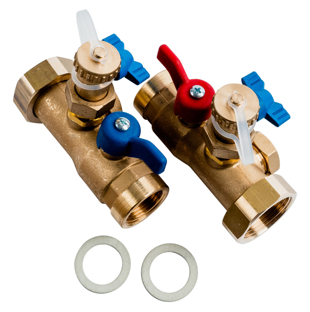 Anschluss am Gerät flachdichtend, Anschluss für Sicherheitsventil, weitere Anschlüsse z. B. für Überströmbrücke, Anschluss am Heizungsvorlauf/-rücklauf mit Kugelhähnen 1" IG, 2 KFE Hähne