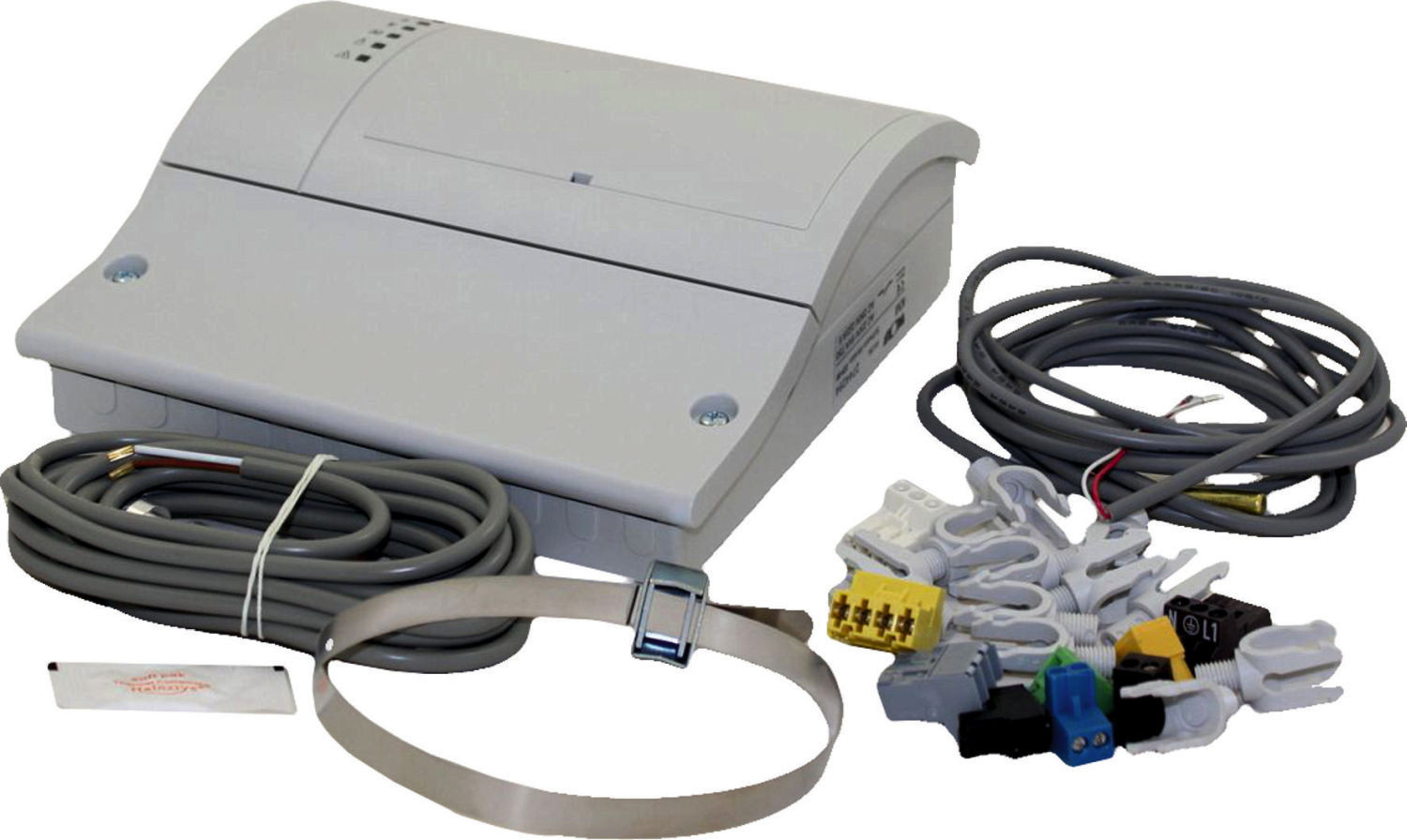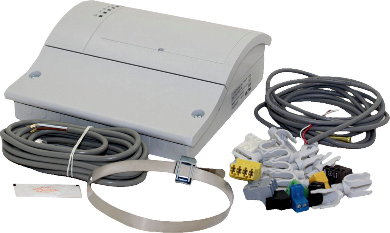 Erweiterungsmodul zur Regelung von Anlagen mit hydraulischer Weiche oder Kaskadenansteuerung, Bedienmodul BM einclipsbar oder mit Wandsockel als Fernbedienung erweiterbar, Konfiguration des Reglers durch Auswahl von vordefinierten Anlagenvarianten, Ansteuerung eines Mischerkreises, 0-10V-Eingang fur GLT-Anlagen, Störmeldeausgang 230V, eBus-Schnittstelle mit automatischem Energiemanagement, Rast 5 Anschlusstechnik, Bedienmodul BM einclipsbar oder mit Wandsockel als Fernbedienung erweiterbar