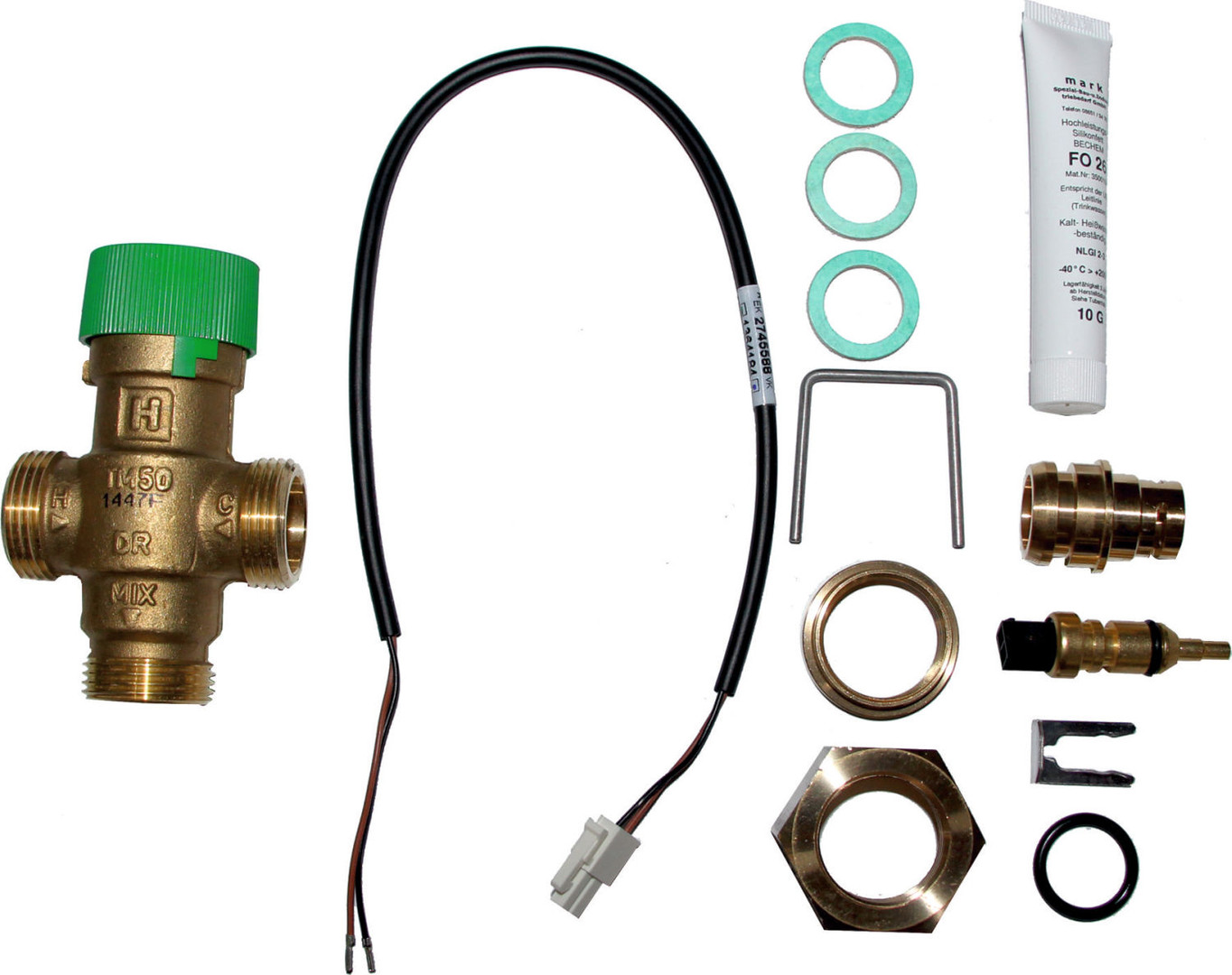 bestehend aus 1x thermischem Mischventil G 3/4, 1x Überwurfmutter G 3/4, 1x Gegenring G 3/4, 1x Sicherungsfeder, 3x Flachdichtungen 24 x 17 x 2, 1x Einsteckfühler NTC 5k Messing Molex, 1x Fühlerdeckel, 1x O-RING 17,12 x 2,62 EPDM, 1x Clip, 1x Silikonfett 10 g-Tube, 1x Anschlusskabel