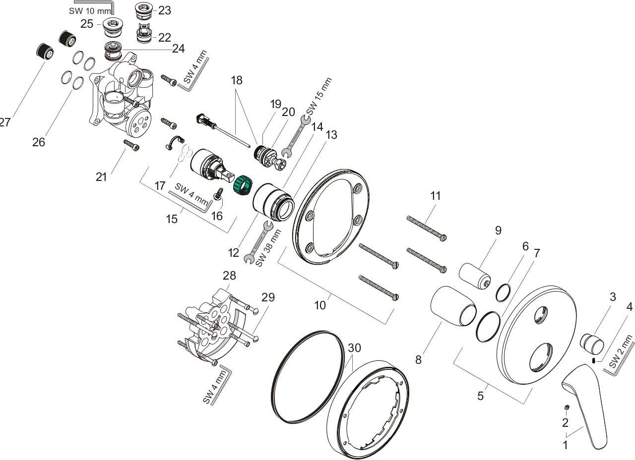 Anschlussart Grundkörper, Durchflussmenge oberer Abgang 21 l/min, Durchflussmenge unterer Abgang 29 l/min, Mindestfließdruck 1 bar, Betriebsdruck min. 1/max. 10 bar, Keramikmischsystem, Temperaturbegrenzung einstellbar, Umsteller mit automatischer Rückstellung, mit Schalldämpfer