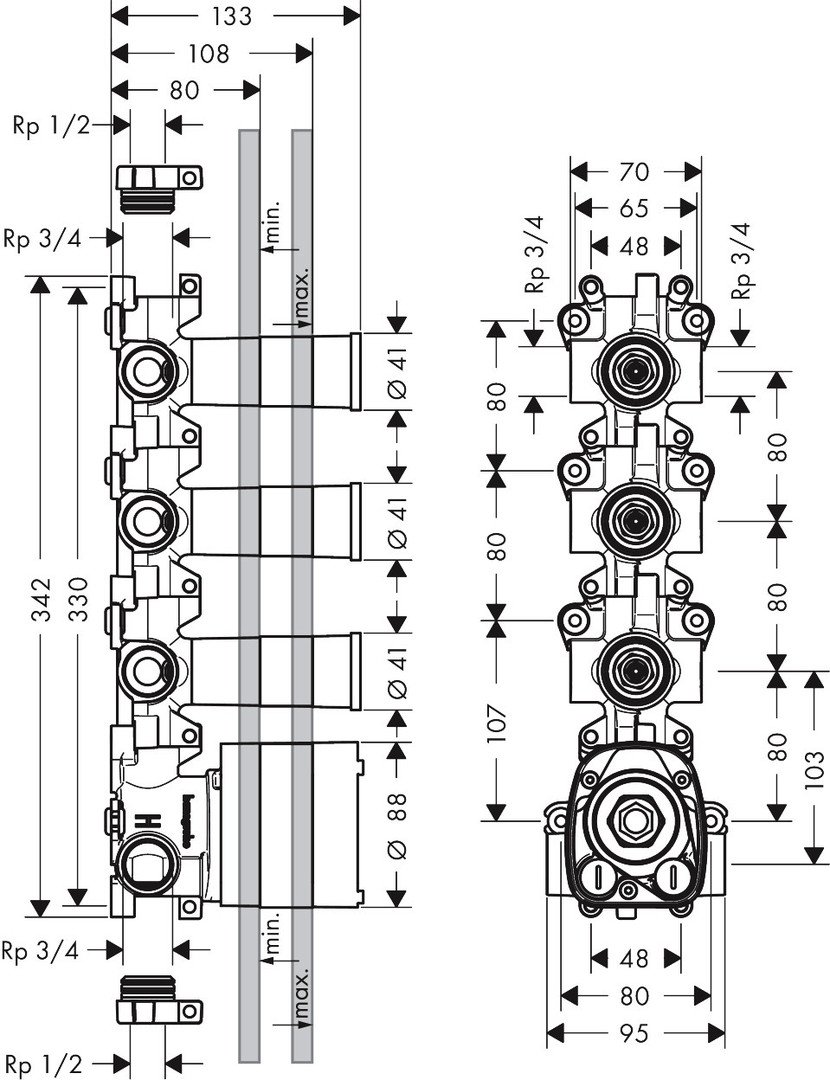 Durchflussmenge bei freiem Durchfluss 59 l/min, Spindelventile, gleichzeitige Nutzung von 3 Verbrauchern, Anschluss von links oder rechts, horizontale oder vertikale Montage, schallentkoppelte Montage, dient gleichzeitig im direkten Verbund als Wasserführung bzw. der maßgenauen Montage, Anschlussgröße DN 20