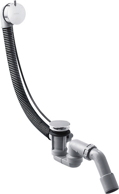 für Normalwannen, bestehend aus Grundkörper, Fertigset, PE-Verschraubung G 1 1/2 x 40/50 mm, flexibler Überlaufschlauch, Bowdenzuglänge 520 mm, Geruchverschluss, Stauwasserhöhe beträgt 50 mm