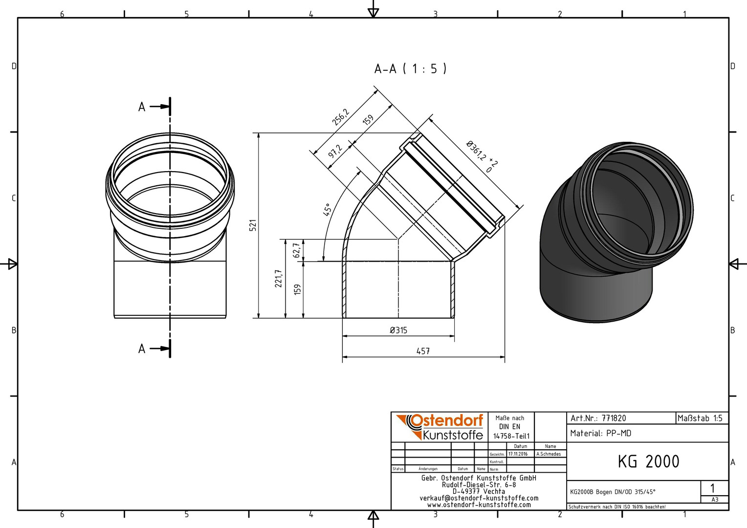 Ostendorf KG2000 Bogen B DN/OD 315, 45Grad