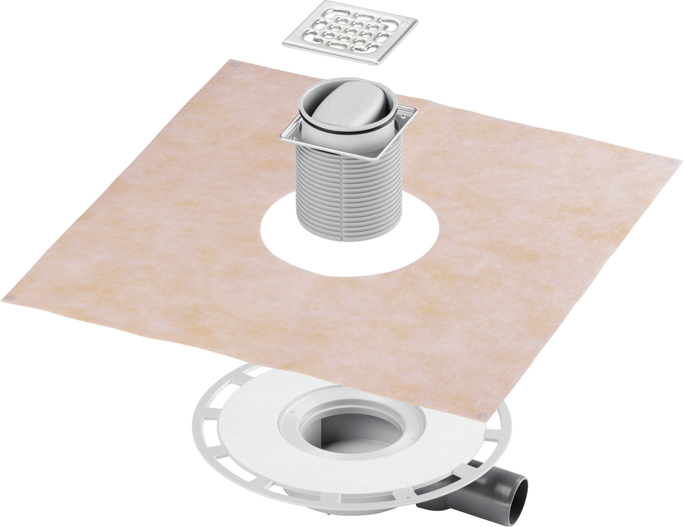 für Verbundabdichtung (geflieste Dusche) mit Abdichtungsmatte, Systemmaß 100, bestehend aus Aufsatz 100 x 100 mm, dreh- und höhenverstellbar, Rost Edelstahl 1.4301, Stopfen, Bauschutz, Schlüter-KERDI-Abdichtungsmanschette, Abdichtungsflansch, Geruchverschluss herausnehmbar, Zulauf DN40, Ablaufrohr mit Kugelgelenk klebbar (ASA), Sperrwasserhöhe 30 mm, Belastungsklasse K=300 kg, Ablaufleistung Anstauhöhe 10 mm 0,33 l/s, Ablaufleistung Anstauhöhe 20 mm 0,4 l/s, Ablaufleistung nach DIN EN 1253