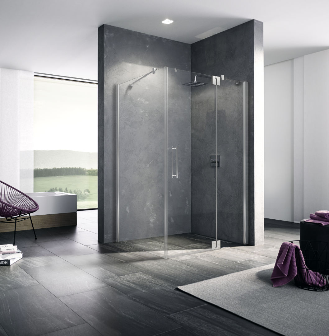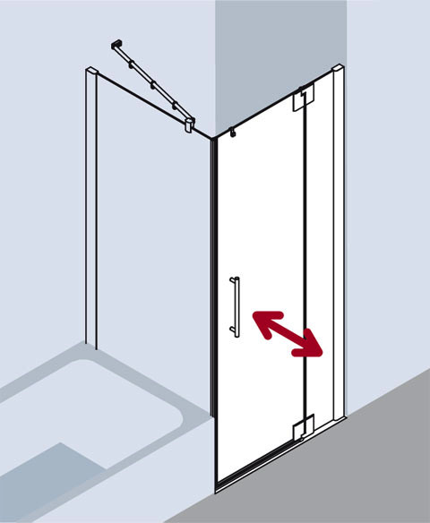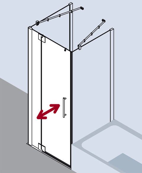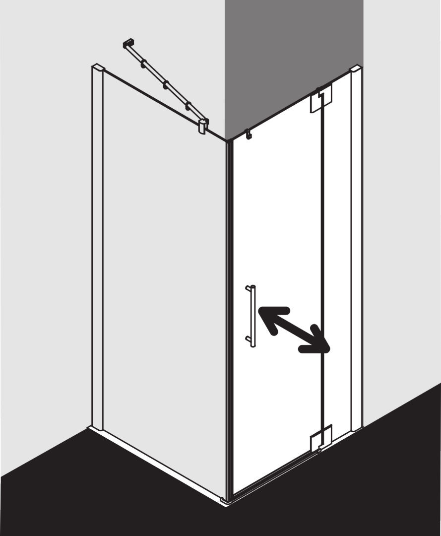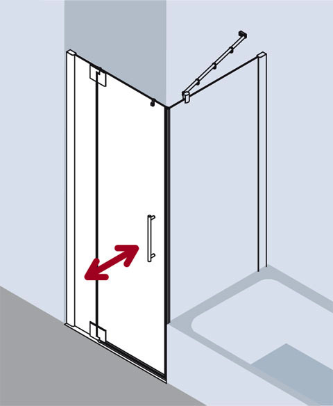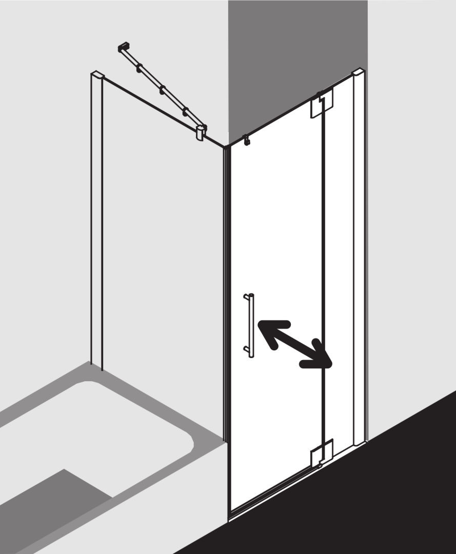 zur Kombination verschlussseitig mit PX TWD Seitenwand und PX TVD Seitenwand verkürzt neben Badewanne, teilgerahmte Tür mit einem Glasflügel, nach innen und außen öffnend und einem Festfeld, optional mit PASA-Stabilisierung (innen), Glasstärke 8 mm Einscheiben-Sicherheitsglas nach EN 12150, optional mit Pflegeleicht-Beschichtung, Profile auseloxiertem Aluminium, Beschläge und Griffe aus Metall, Verstellmöglichkeit im Wandprofil 30 mm, Beschläge mit Hebe-Senk-Mechanismus und innen bündig mit der Glasoberfläche, durchgehende Magnetleiste und Dichtprofile, waagerechte Dichtleiste mit Wasserabpralleffekt, mit 6 mm Bodenschwelle, geprüft nach DIN EN 14428, mit Befestigungsmaterial und transparentem Handtuchhalter-Haken, die Schräge unter dem Festfeld darf max. 2 mm betragen, die Gesamtschräge 3 mm