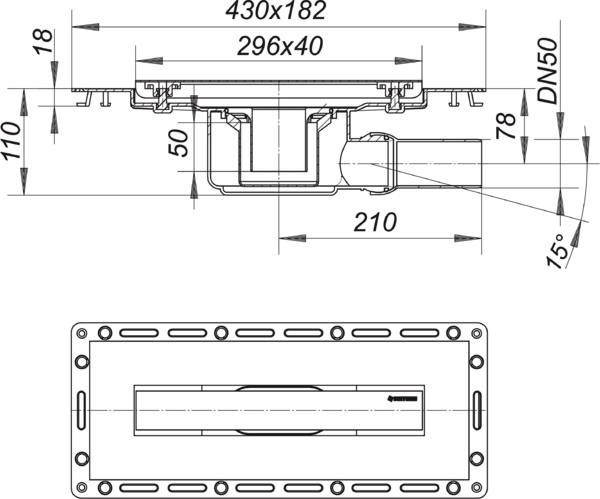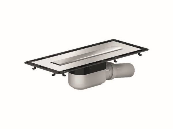 Ablaufstutzen DN 50 seitlich, mit Kugelgelenk verstellbar von 0–15°, Vlies-kaschierter Flansch, Tisto-Dichtmanschette, Bauschutz, herausnehmbarer Geruchs- und Reinigungsverschluss, Sperrwasserhöhe 50 mm (gem. DIN EN 1253), höhenverstellbare Justierschrauben, Fliesenanschlag, Ablaufgehäuse Polypropylen, hochschlagfest, Abdeckung Edelstahl 1.4301, 300 x 40 mm, Belastungsklasse K 3 (300 kg), TistoLine Standard 300 geeignet für Bodenbeläge 2-12 mm (mit Kleber), TistoLine Design 300 geeignet für Bodenbeläge 5-15 mm (mit Kleber)