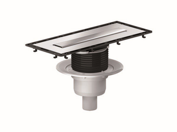 Ablaufstutzen DN 50 senkrecht, Vlies-kaschierter Flansch, Tisto-Dichtmanschette, Bauschutz, herausnehmbarer Geruchs- und Reinigungsverschluss, Sperrwasserhöhe 50 mm (gem. DIN EN 1253), höhenverstellbare Justierschrauben, Fliesenanschlag, Ablaufgehäuse Polypropylen, hochschlagfest, Abdeckung Edelstahl 1.4301, 300 x 40 mm, Belastungsklasse K 3 (300 kg), Standard 300 geeignet für Bodenbeläge 2-12 mm (mit Kleber), Design 300 geeignet für Bodenbeläge 5-15 mm (mit Kleber)