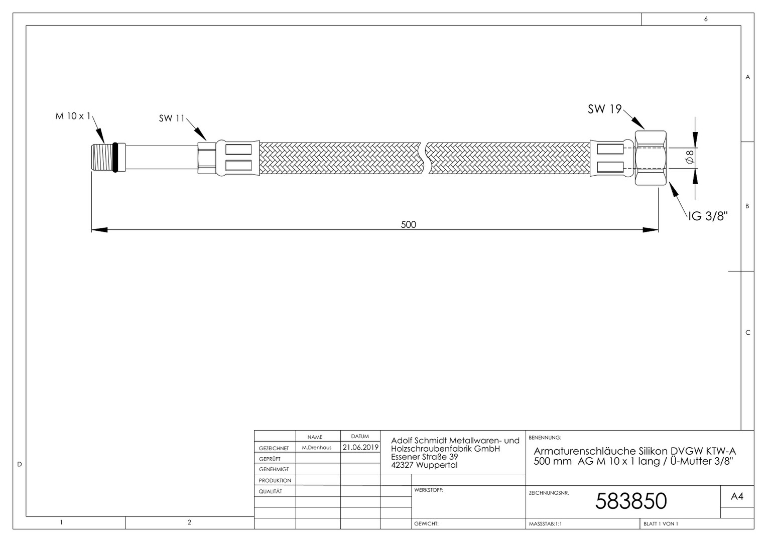 ASW Flex-Trinkwasserschlauch AG M 10 x 1, 500 mm, lang, Überwurfmutter IG 3/8"