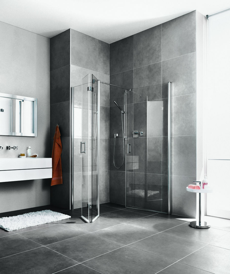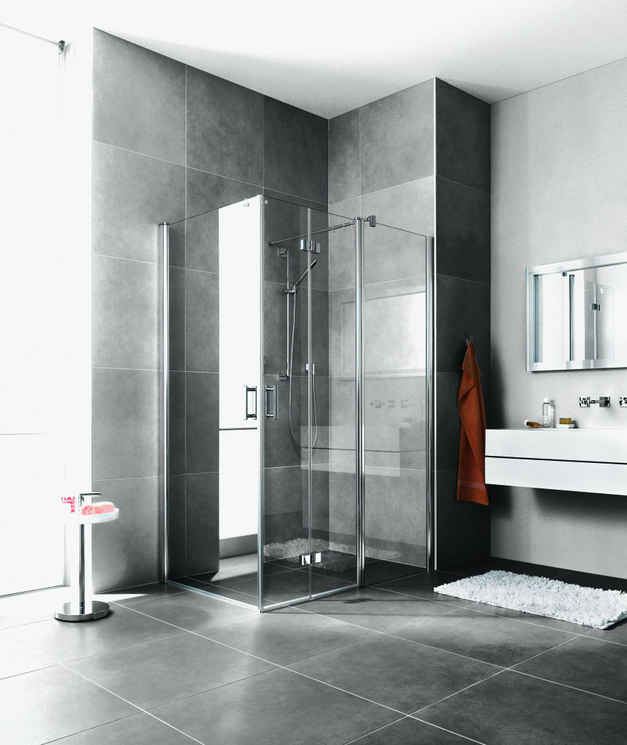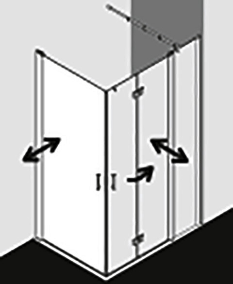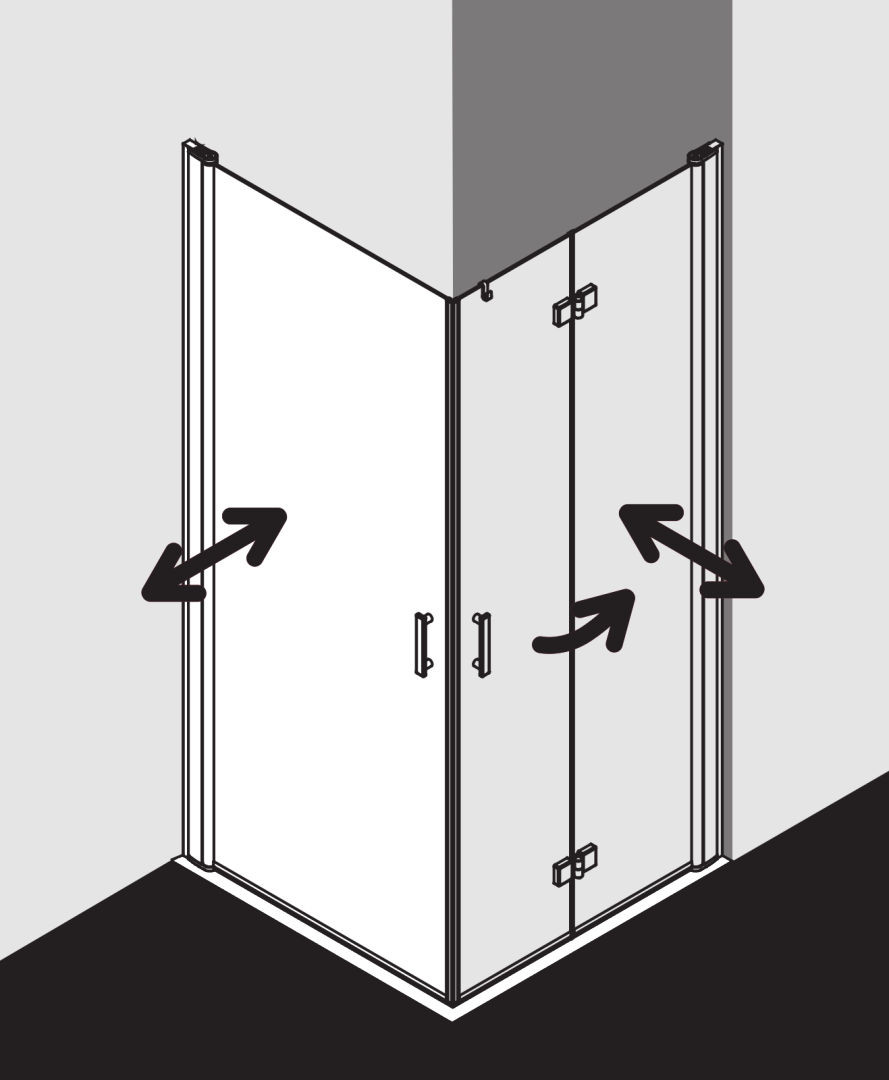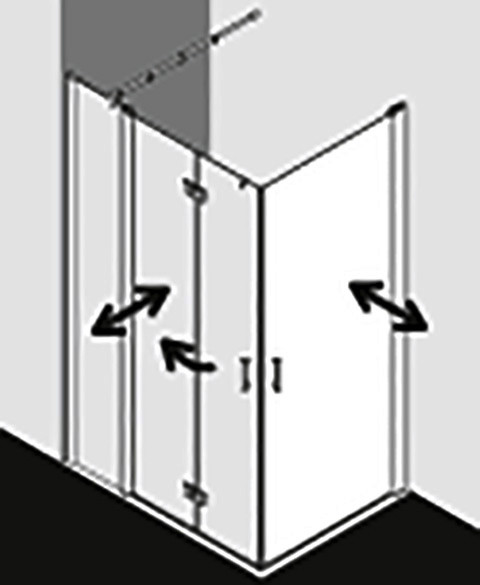 kompletter Eckeinstieg bestehend aus DI 1ER/L (Pendeltür) Halbteil und DI 2CR/L Eckeinstieg 2-teilig (Pendel-Falttüren) Halbteil/DI F2R/L Eckeinstieg 2-teilig (Pendel-Falttür mit Festfeld), Kombination von zwei Halbteilen DI 1ER/L (Pendeltür) nicht möglich, teilgerahmt, mit einem Glasflügel, nach innen und außen öffnend, Glasstärke 6 mm Einscheiben-Sicherheitsglas nach EN 12150, optional mit Pflegeleicht-Beschichtung, Profile aus eloxiertem Aluminium, Griffe aus Metall, Verstellmöglichkeit im Wandgelenkprofil 20 mm, Wandgelenkprofil mit Hebe-Senk-Mechanismus, durchgehende Magnetleisten und Dichtprofile, waagerechte Dichtleiste mit Wasserabpralleffekt, 6 mm Bodenschwelle, mit Befestigungsmaterial und transparentem Handtuchhalter-Haken, geprüft nach DIN EN 14428, waagerechte Schräge darf max. 5 mm betragen, Höhe mit Wandgelenkprofil 2017 mm