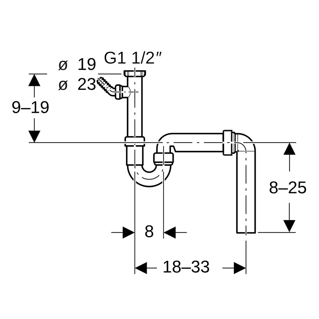 zum Anschließen von Spültischen mit einem Becken, güteüberwacht nach EN 274-3, mit Anschluss für Waschmaschine oder Geschirrspüler, Kunststoff, bestehend aus Einlaufstutzen mit Überwurfmutter aus PP, G 1 1/2, mit Zusatzanschluss, Winkelschlauchtülle aus PP-Ø 19/23 mm, Anschlussbogen 90° aus PP, Blindkappe für Anschluss G 1