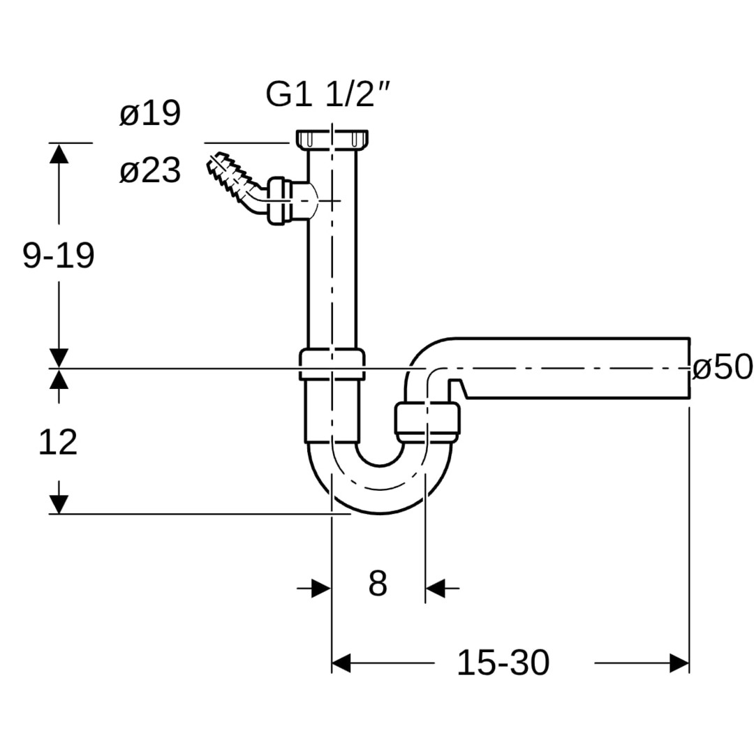 zum Anschließen von Spültischen mit einem Becken, güteüberwacht nach EN 274-3, mit Anschluss für Waschmaschine oder Geschirrspüler, Kunststoff, bestehend aus Einlaufstutzen mit Überwurfmutter aus PP, G 1, mit Zusatzanschluss, Winkelschlauchtülle aus PP-Ø 19/23 mm, Blindkappe für Anschluss G 1
