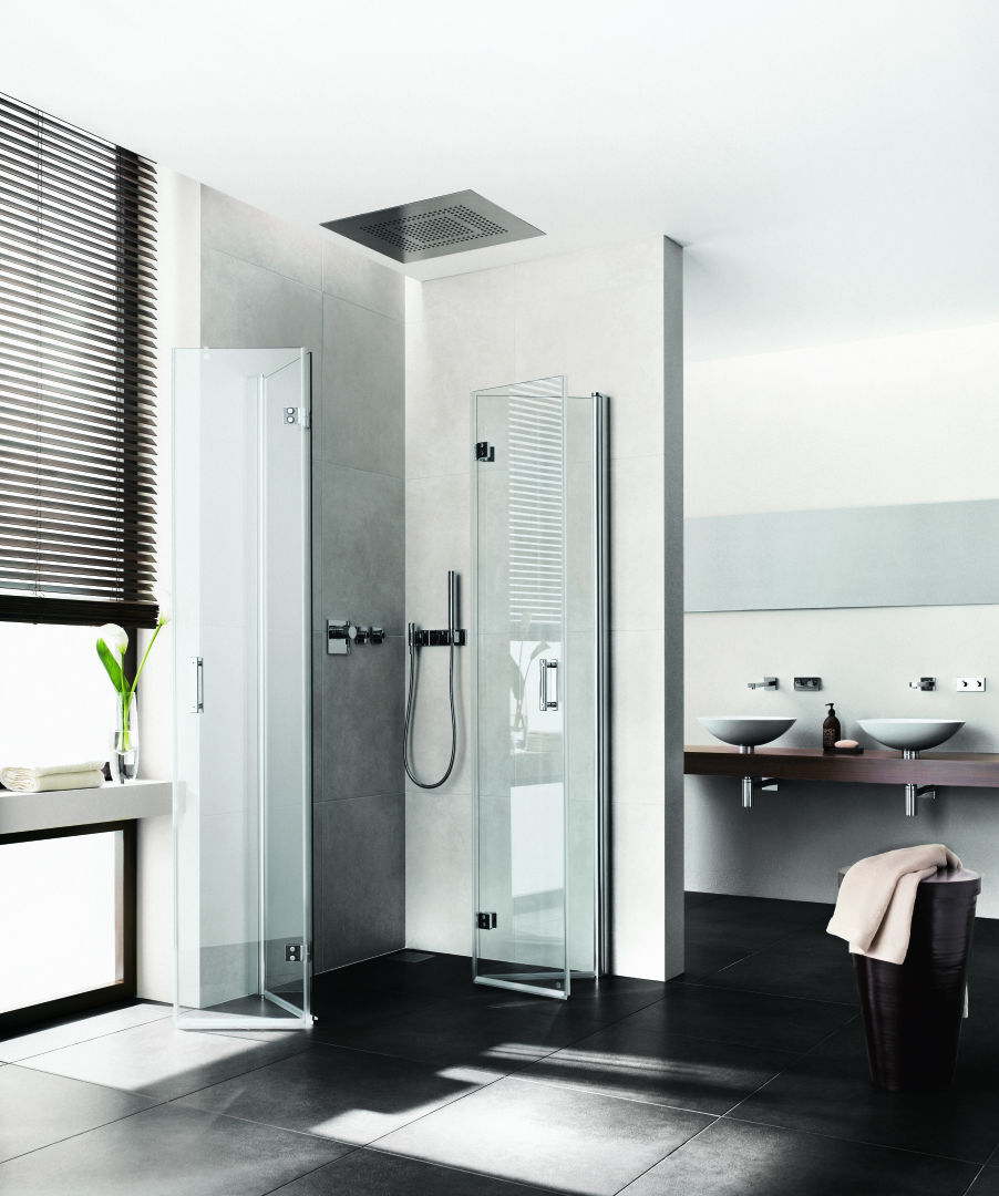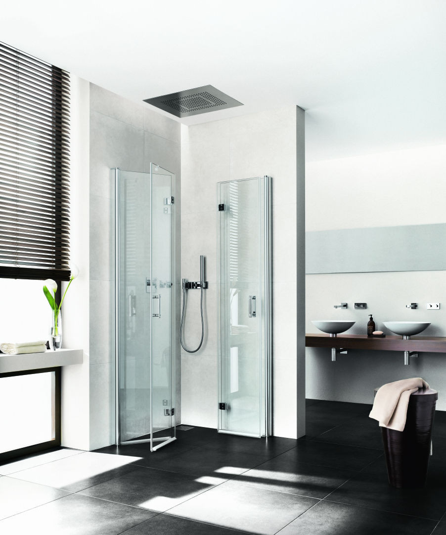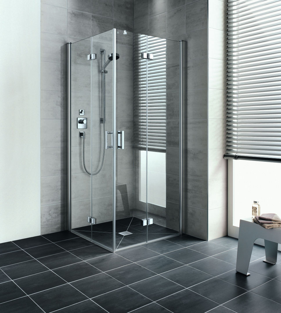 kompletter Eckeinstieg bestehend aus DI 2CR Eckeinstieg 2-teilig (Pendel-Falttüren) Halbteil rechts, DI 2CL Eckeinstieg 2-teilig (Pendel-Falttüren) Halbteil links, Halbteile unterschiedlicher Breite beliebig kombinierbar, Kombination mit DI 1ER/L Eckeinstieg (Pendeltür) Halbteil/DI EPR/L Eckeinstieg 2-teilig (Pendeltür mit Festfeld) Halbteil/DI F2R/L Eckeinstieg 2-teilig (Pendel-Falttür mit Festfeld) Halbteil möglich, teilgerahmt, mit vier Glasflügeln, im Wandgelenkprofil 90° nach innen und außen schwenkbar, im Beschlagsgelenk 180° nach außen schwenkbar, Glasstärke 6 mm Einscheiben-Sicherheitsglas nach EN 12150, optional mit Pflegeleicht-Beschichtung, Profile aus eloxiertem Aluminium, Beschlagsgelenke und Griffe aus Metall, Verstellmöglichkeit im Wandgelenkprofil 20 mm, Wandgelenkprofile mit Hebe-Senk-Mechanismus, Beschlagsgelenke mit Hebe-Senk-Mechanismus und innen bündig mit der Glasoberfläche, durchgehende Magnetleisten und Dichtprofile, waagerechte Dichtleiste mit Wasserabpralleffekt, 6 mm Bodenschwelle, mit Befestigungsmaterial und transparentem Handtuchhalter-Haken, geprüft nach DIN EN 14428, waagerechte Schräge darf max. 5 mm betragen, Höhe mit Wandgelenkprofil 2017 mm